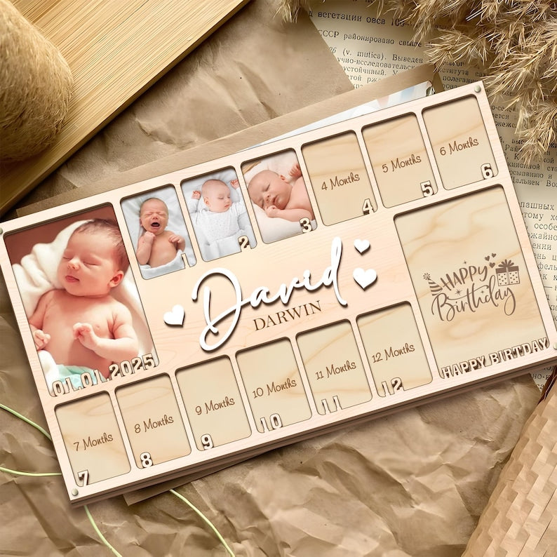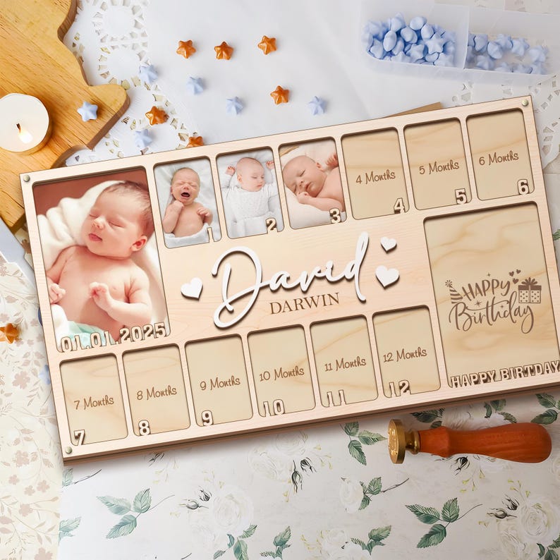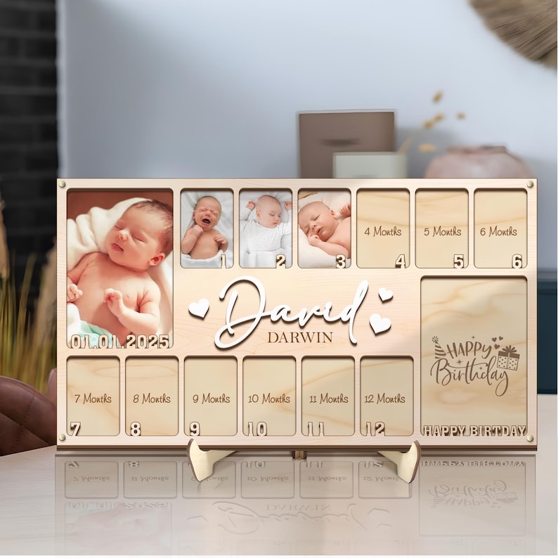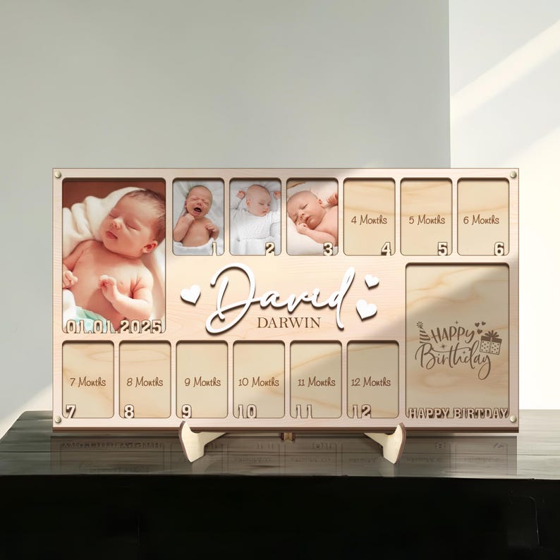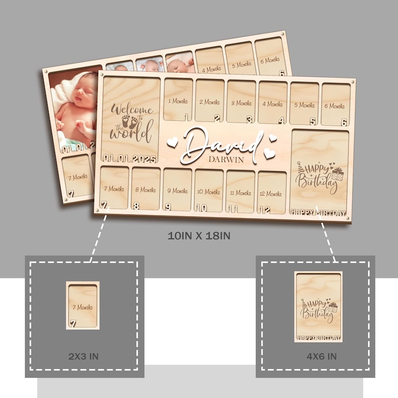 - Our photo frame captures the journey from birth to 1 year old, designed to fit standard wallet-sized photos (2”x3”)