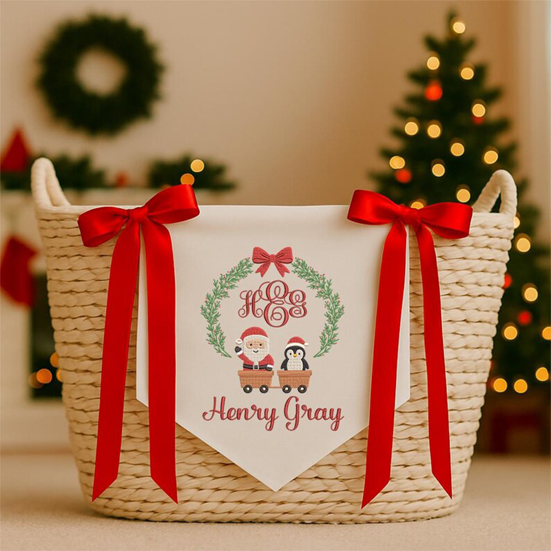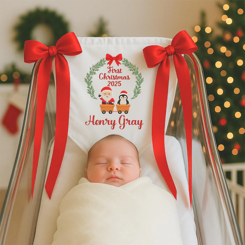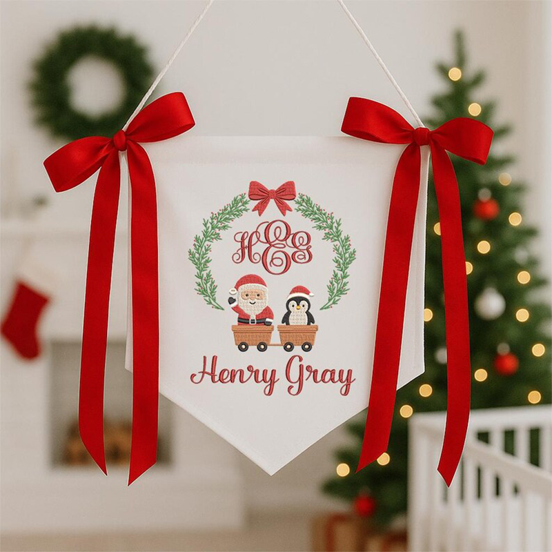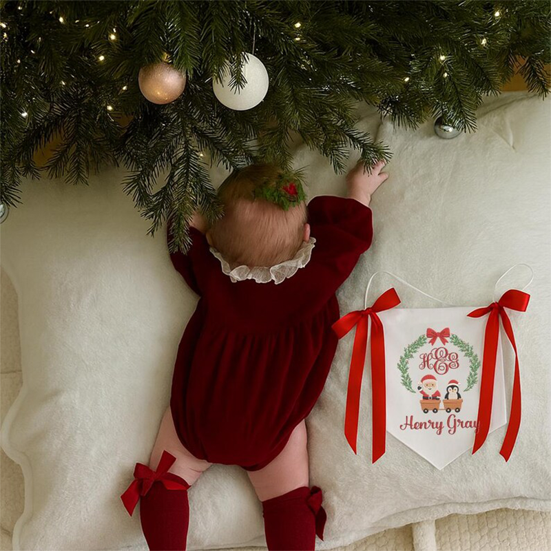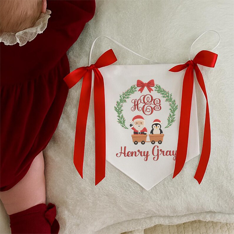 🎄 Personalized Christmas Baby Banner – Embroidered Name or Monogram with Floral Wreath, Satin Bows – Holiday Nursery Decor, Baby Shower Gift, Christmas Keepsake