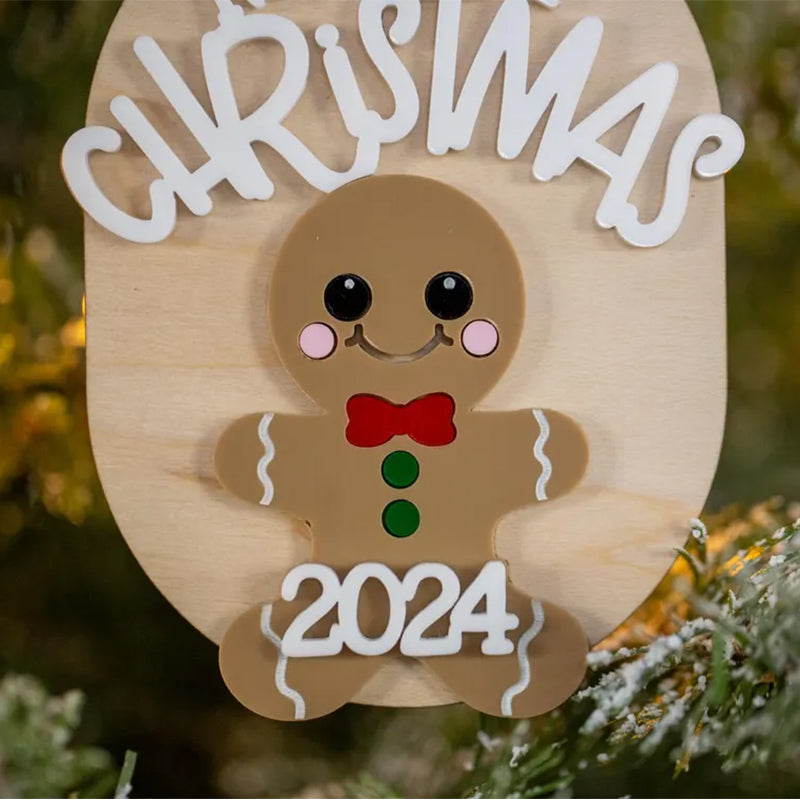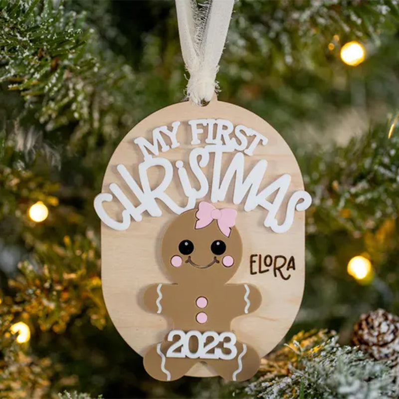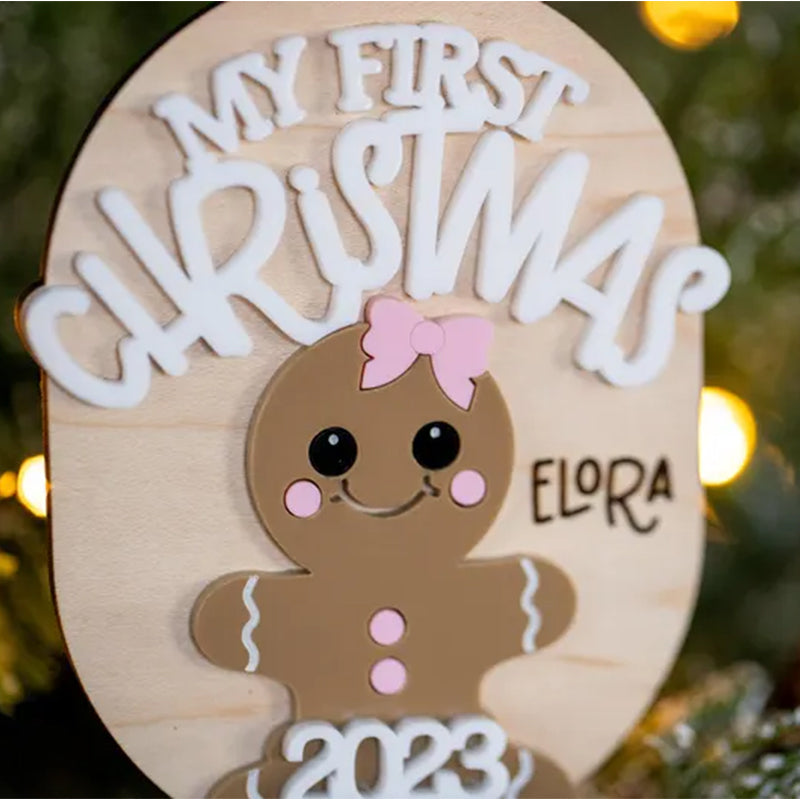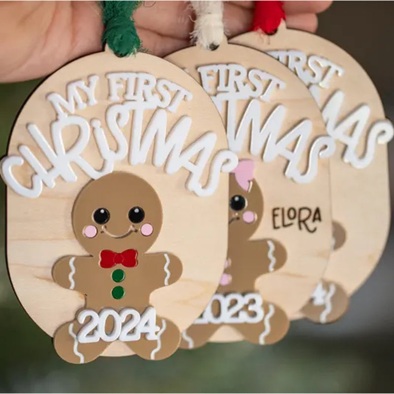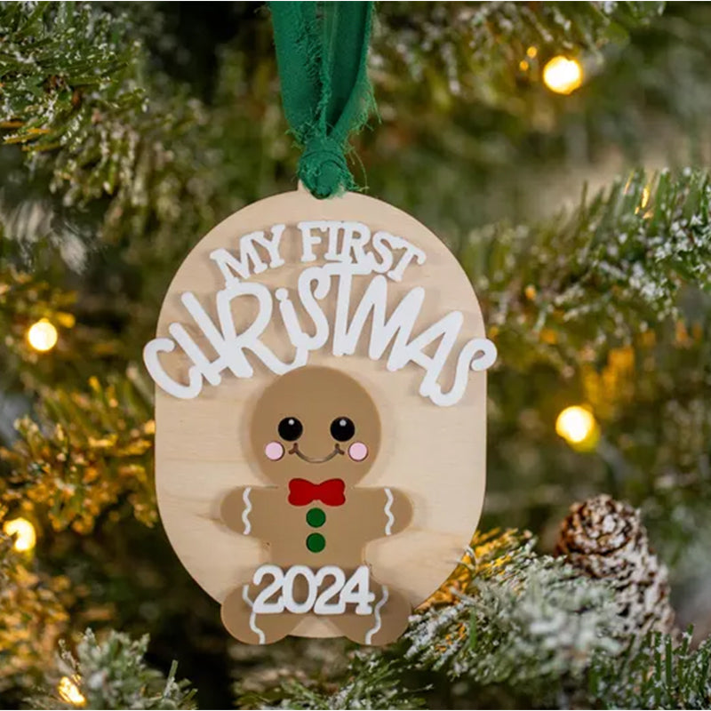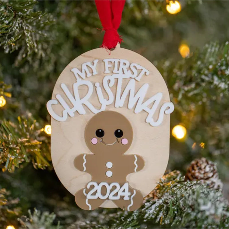 • Celebrate your little one’s first Christmas with a sweet gingerbread keepsake ornament! These 'My First Christmas' ornaments are perfect for marking a special milestone and adding a sweet touch to your holiday decor. Customize the year, choose from a neutral, girl, or boy gingerbread design, and select a ribbon color that fits your style. You can even add a personalized touch by engraving your child’s name onto the wood, making this ornament a treasured keepsake.