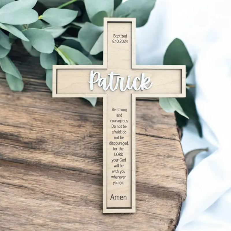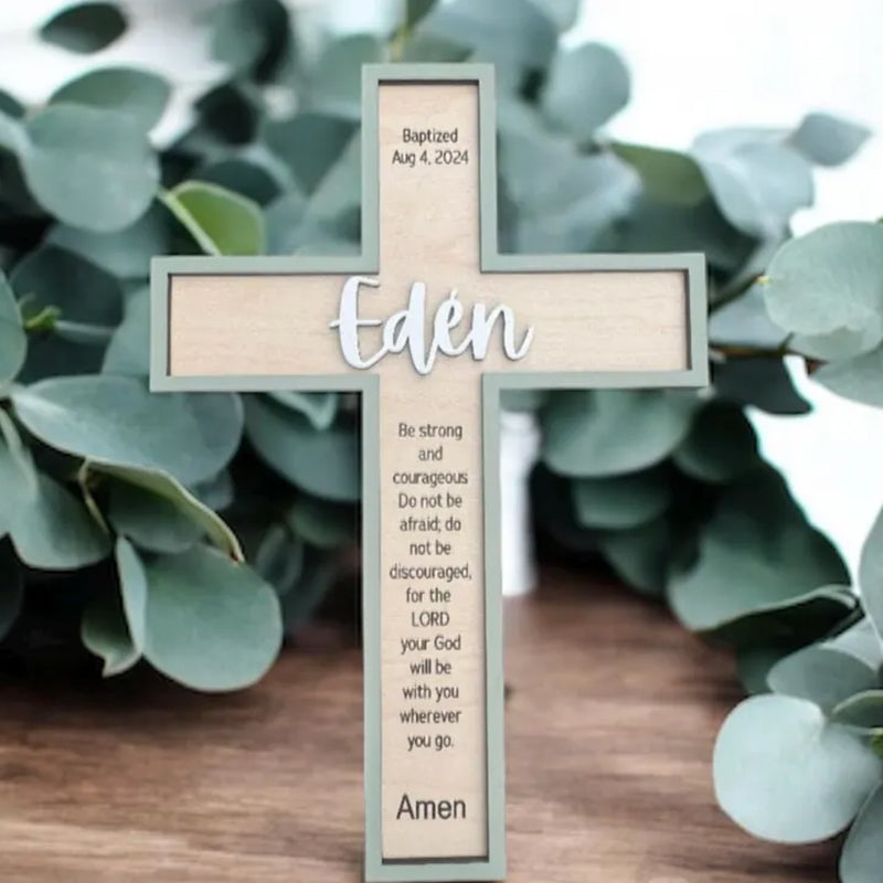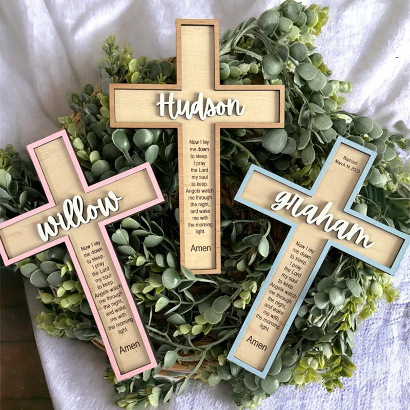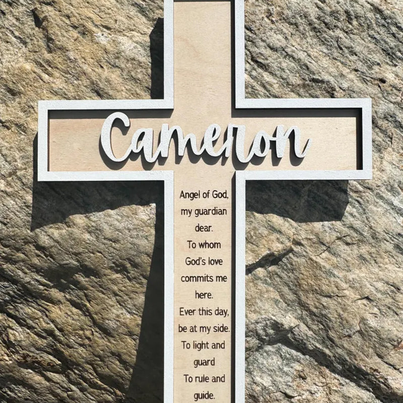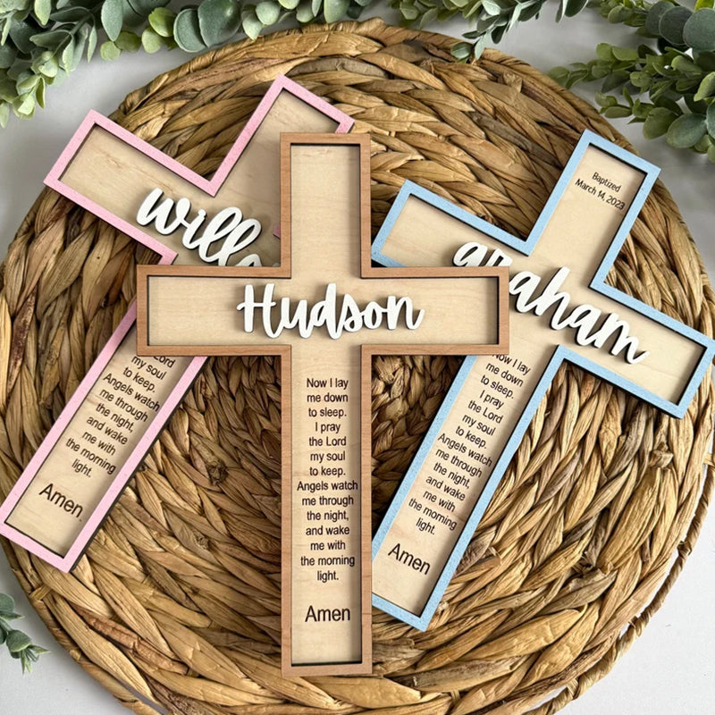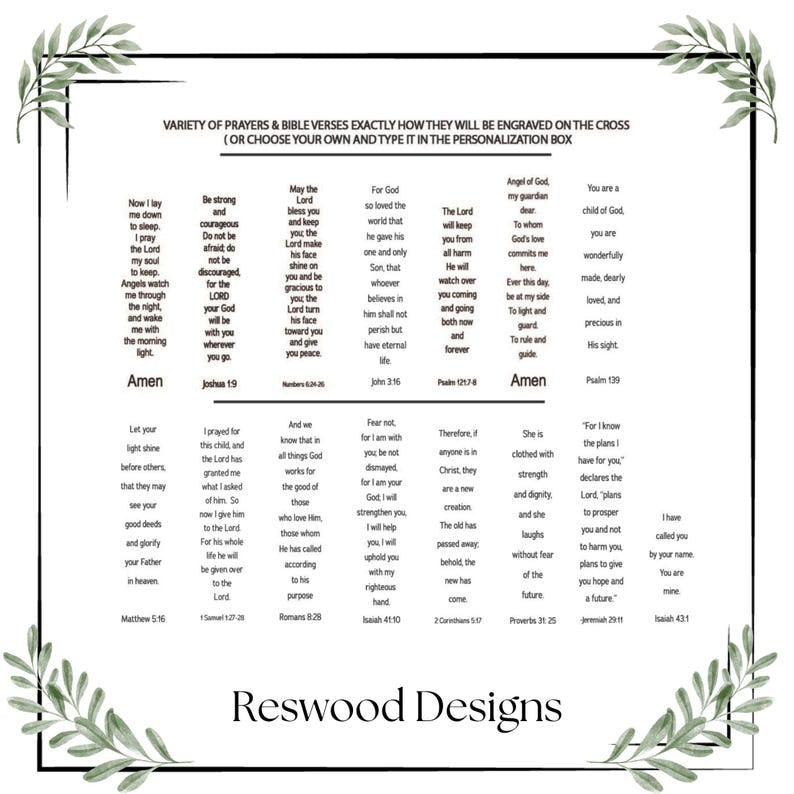 The Cross by default comes with a Sleep Prayer and the 3D name in white with no date. We have other bible verse options listed in the photo section for reference, and you can add the date to the design at no extra cost. We will be happy to customize it with your own verse, quotation or a personal message.