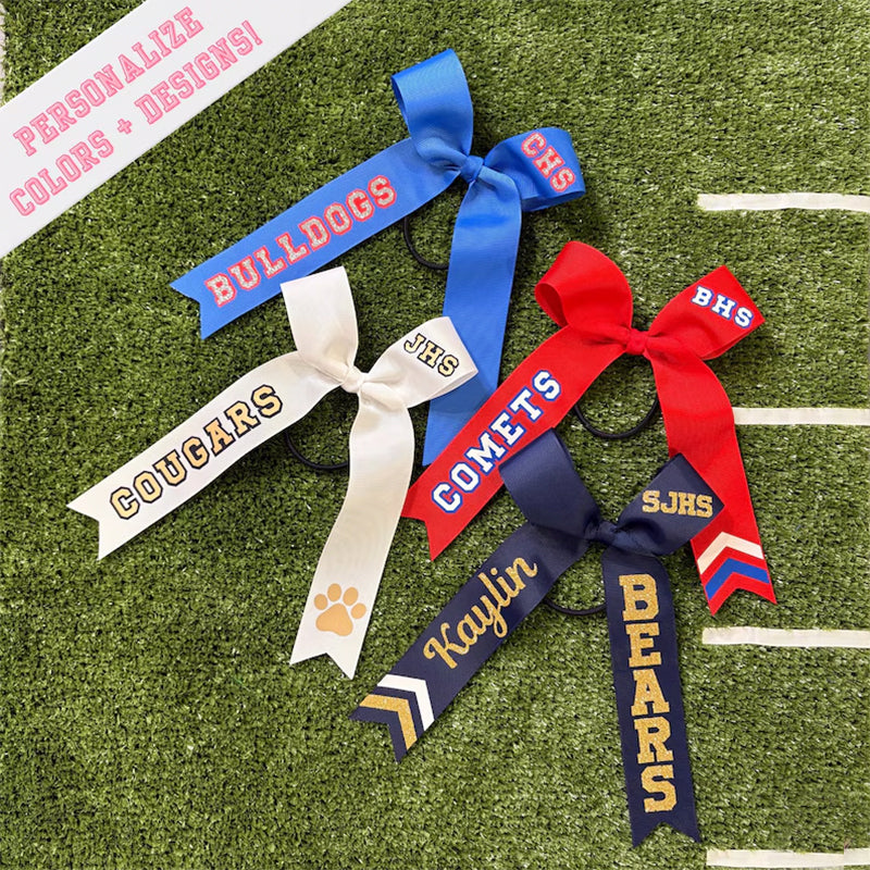 Cheer Game Day Long Tail Ribbon Hair Bow, Personalized with your team colors and logo. Collegiate style cheer bow. Personalized custom bows for your athletes!