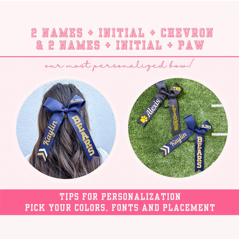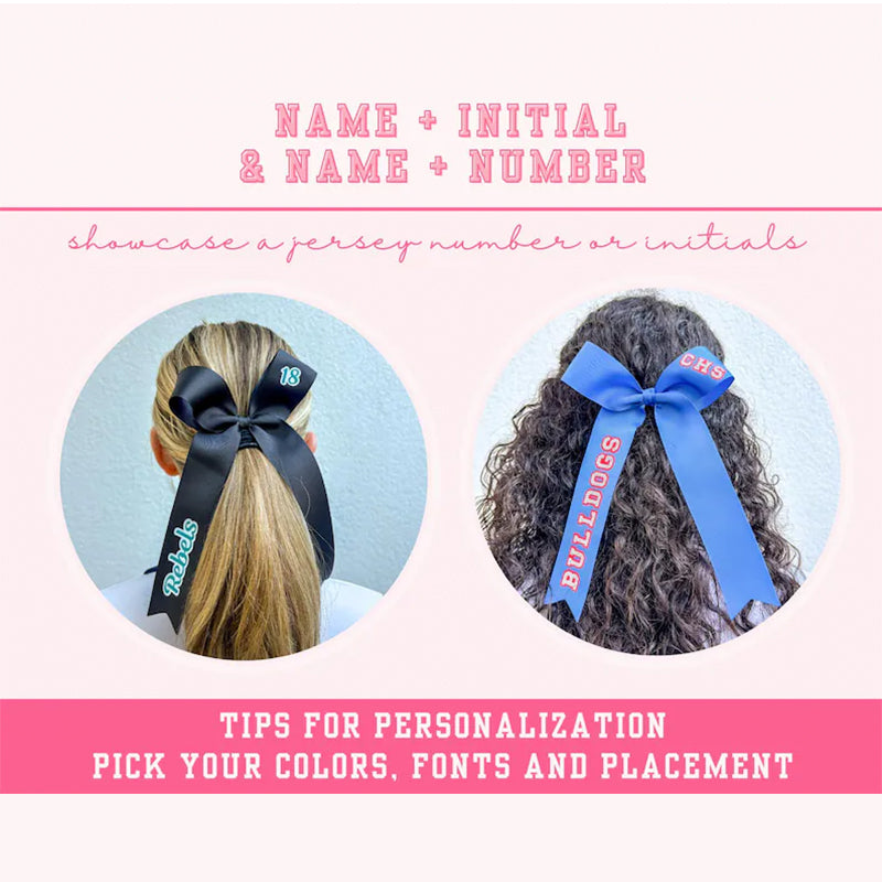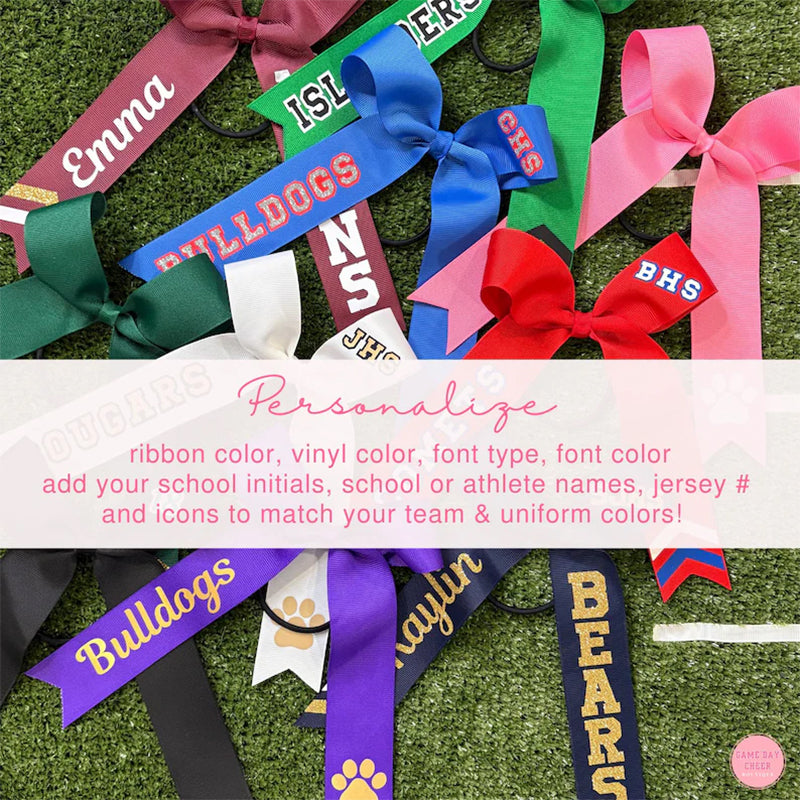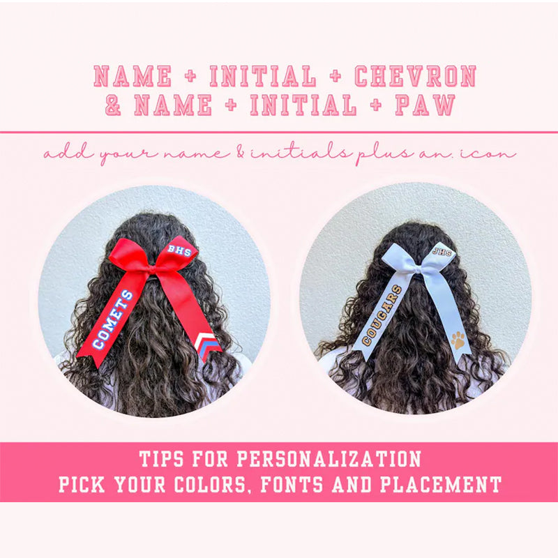2. We'll work with you to create your color combination of ribbon and the heat transfer vinyl decals and create a mock up of design combinations for you to select for your bows: ICON, SCHOOL LOGO, INITIALS, TEAM NAME or ATHLETE NAME