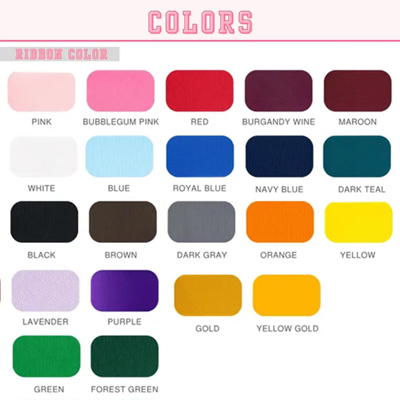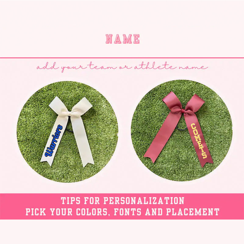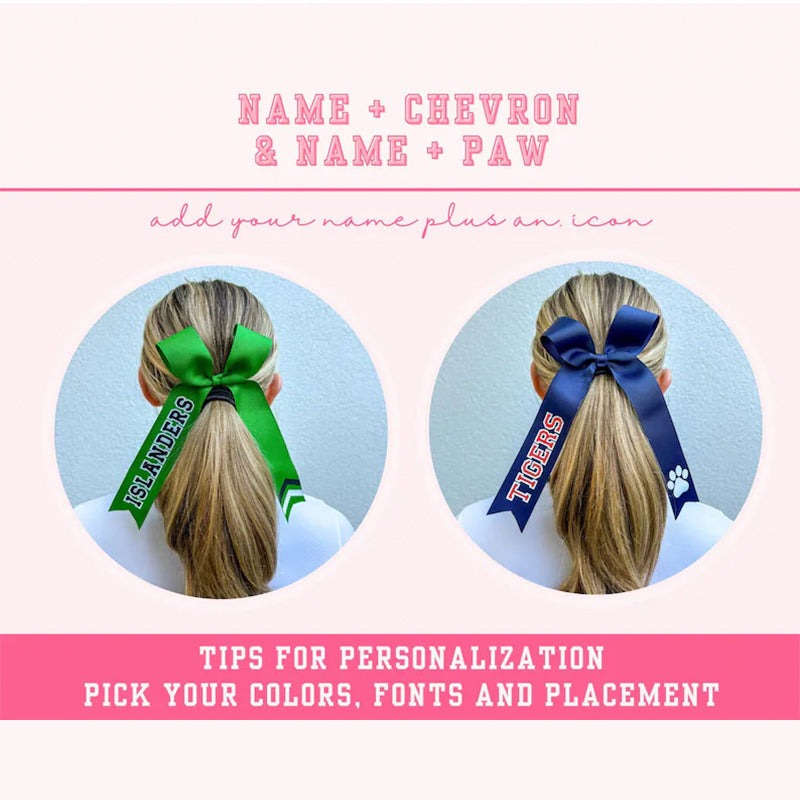 3. Include all details of your personalization when placing your order in the personalization field including ribbon color, vinyl color, placement and text direction (horizontal - bottom to top, or vertical drop - top to bottom).
