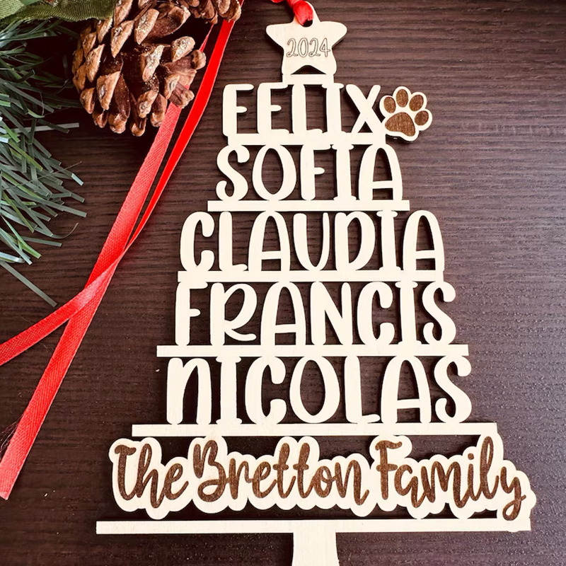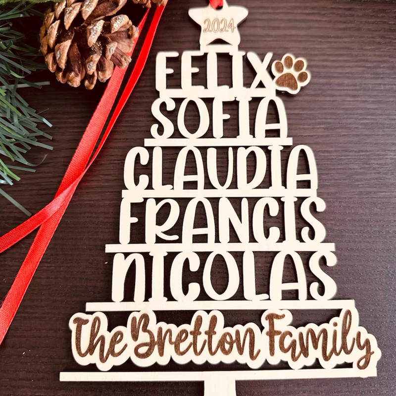 Add a touch of warmth and charm to your holiday decor with our handcrafted wooden Christmas tree ornaments, designed in the shape of a tree. Each ornament can be personalized with the names of family members and pets, creating a unique piece that celebrates your loved ones.