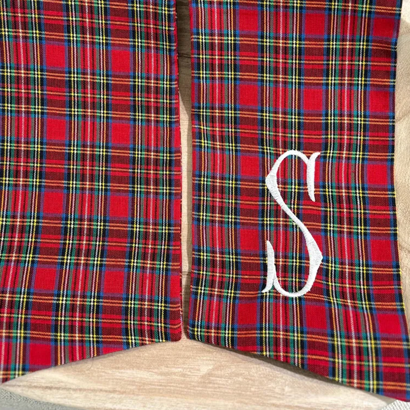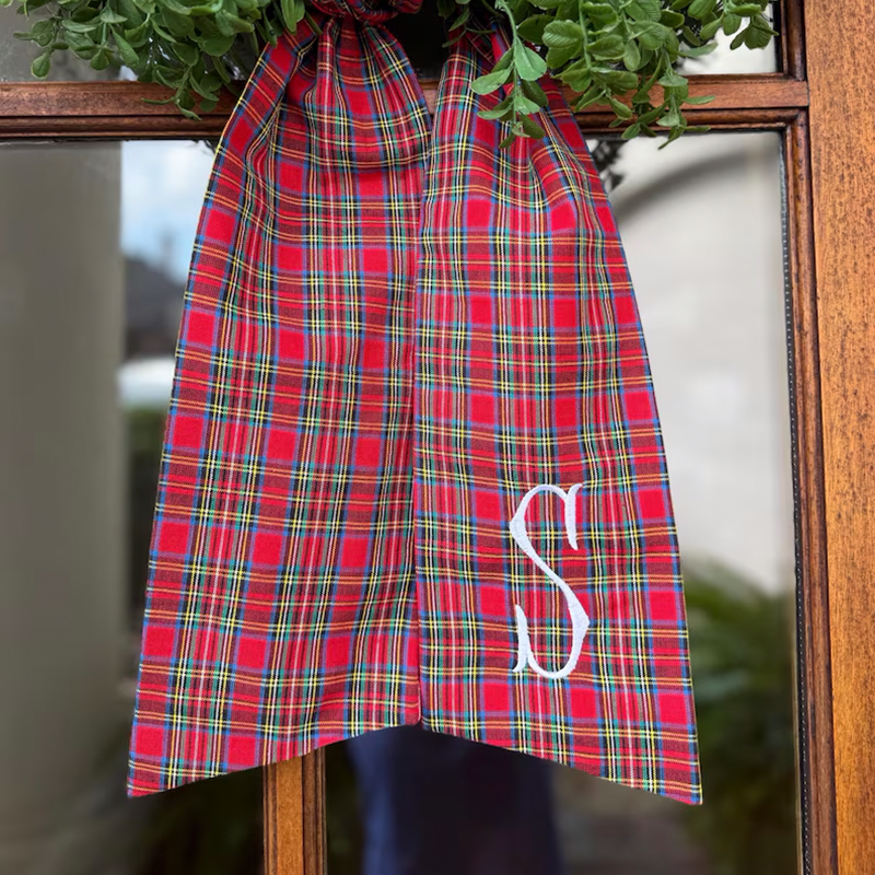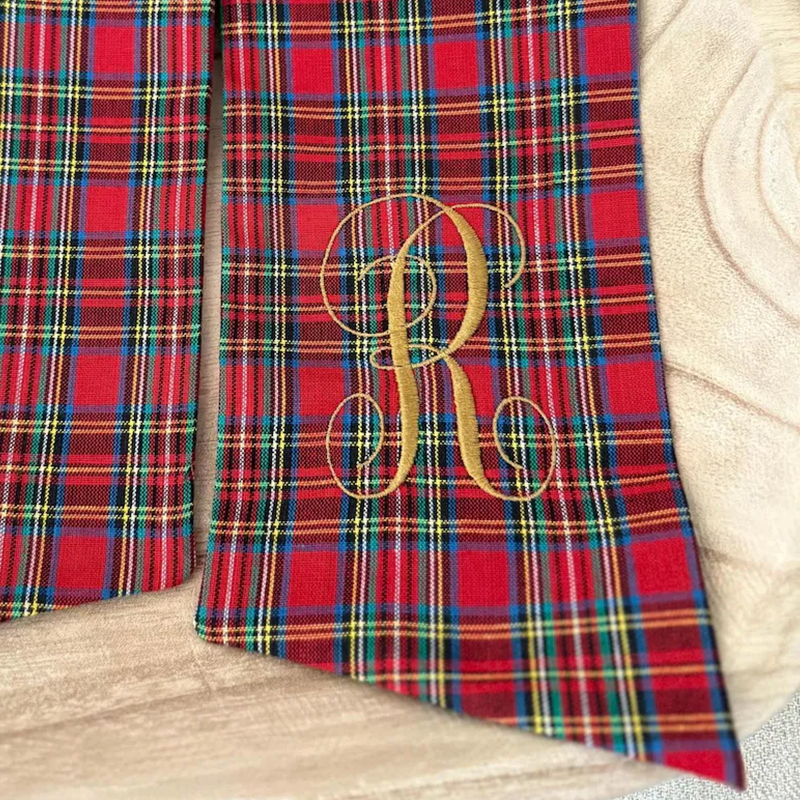 sash + gold initial: plaid red sash with embroidered gold initial