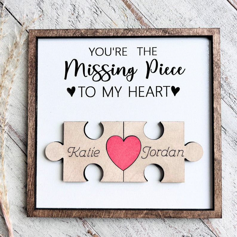 Capture the essence of love with our enchanting Valentine sign for couples: 'You're the Missing Piece to my Heart.' Crafted with care and adorned with romantic flair, this sign is more than just décor—it's a heartfelt expression of the connection you share. The puzzle piece design symbolizes the perfect fit you've found in each other, completing the puzzle of love. Made from high-quality materials, this sign is a timeless and charming addition to your home, reminding you both daily of the love that binds you together. Celebrate the joy of togetherness and gift your special someone a token of your affection that speaks volumes—because with them, your heart is complete.