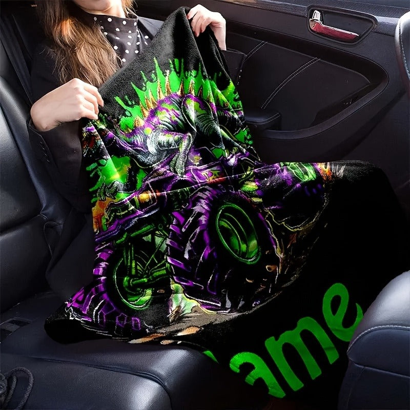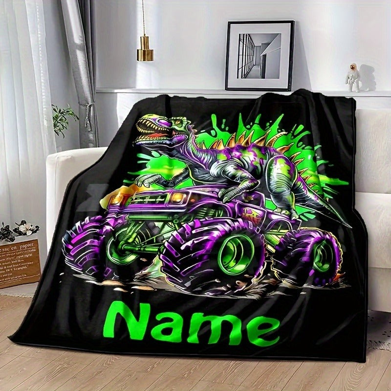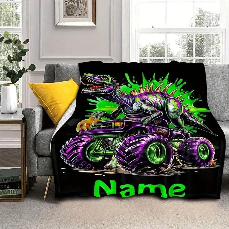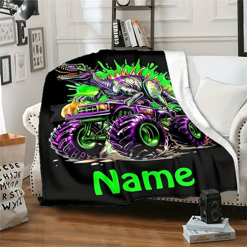 Creative Dinosaur Off-Road Truck Pattern Text Custom Flannel Print Blanket