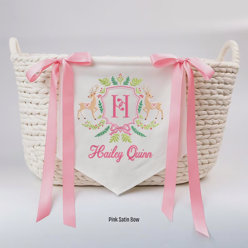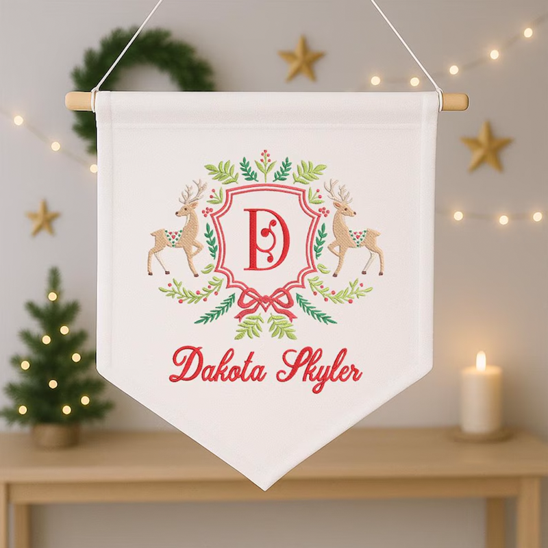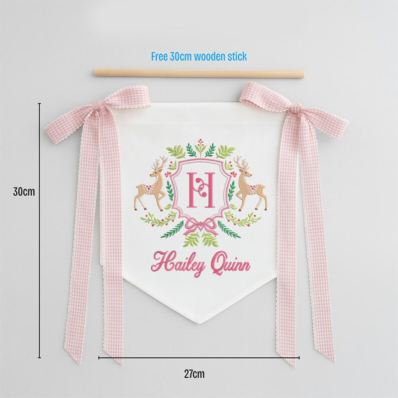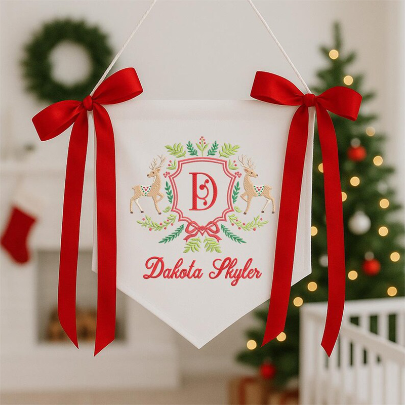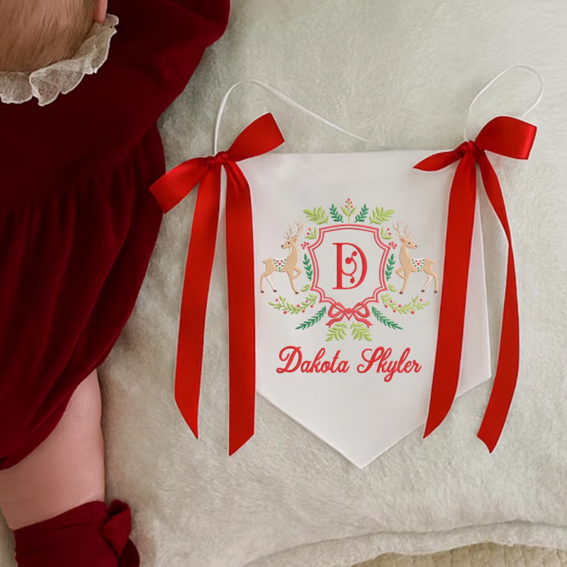 🎄 Personalized Christmas Baby Banner – Embroidered Name or Monogram with Floral Wreath, Satin Bows – Holiday Nursery Decor, Baby Shower Gift, Christmas Keepsake