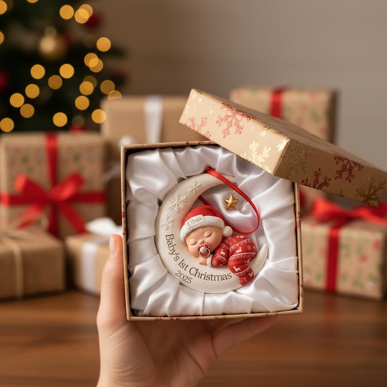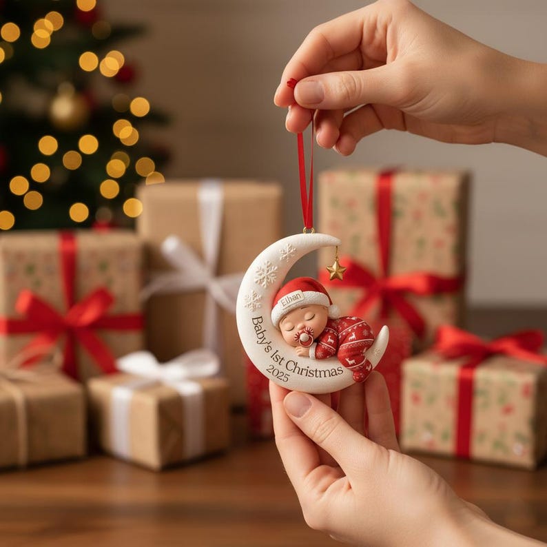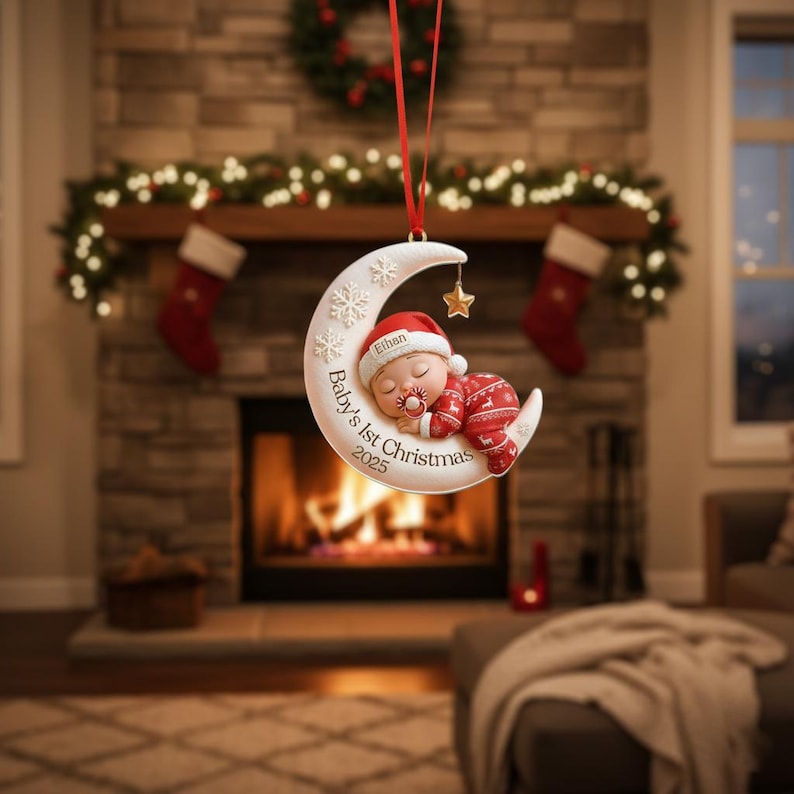 Custom Baby First Christmas Ornament, Personalized Moon Sleeping Acrylic Keepsake