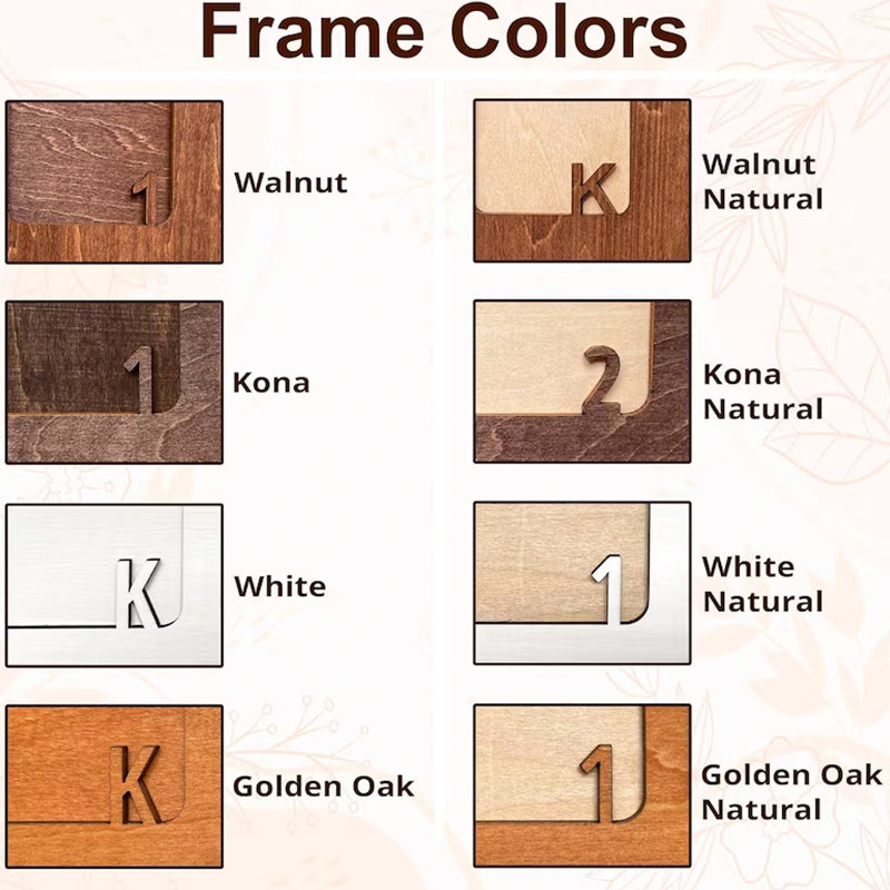 - Select your frame and name colors from the drop-down menu. Laser-cut wood may show charred edges, which will be unpainted.