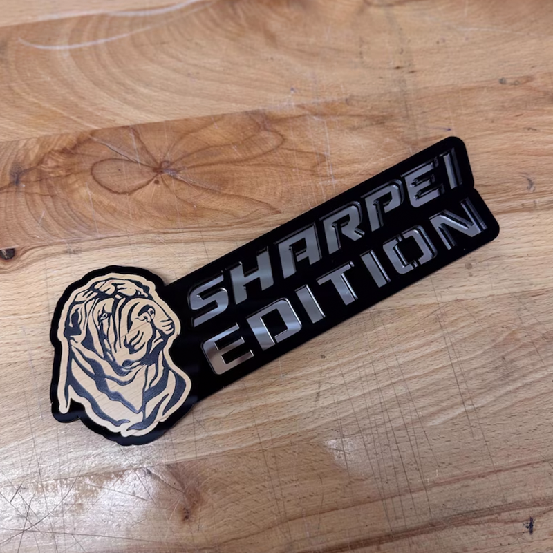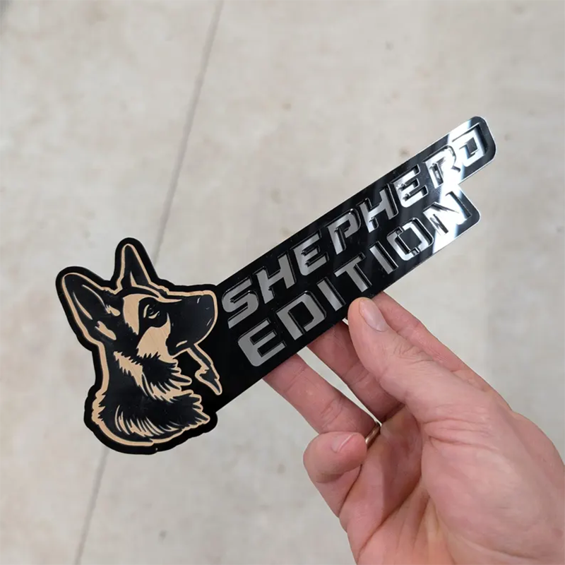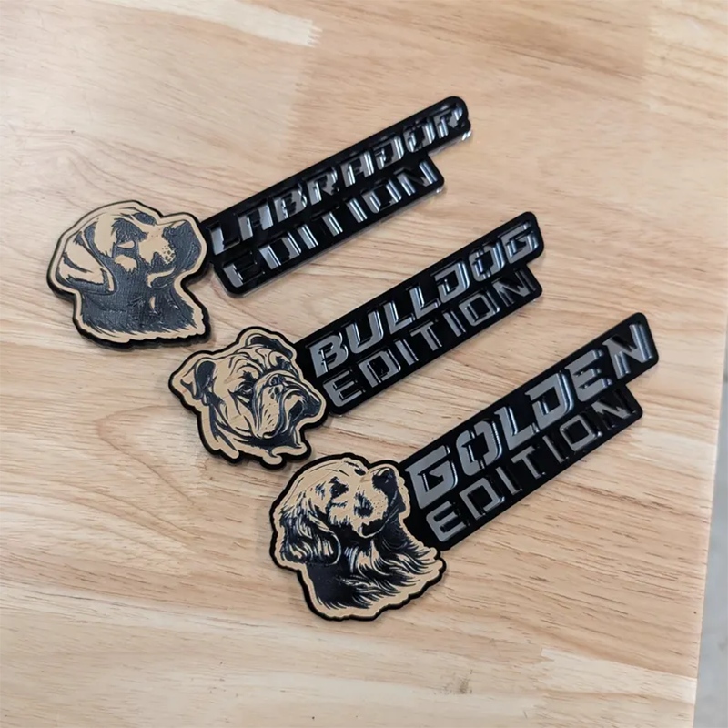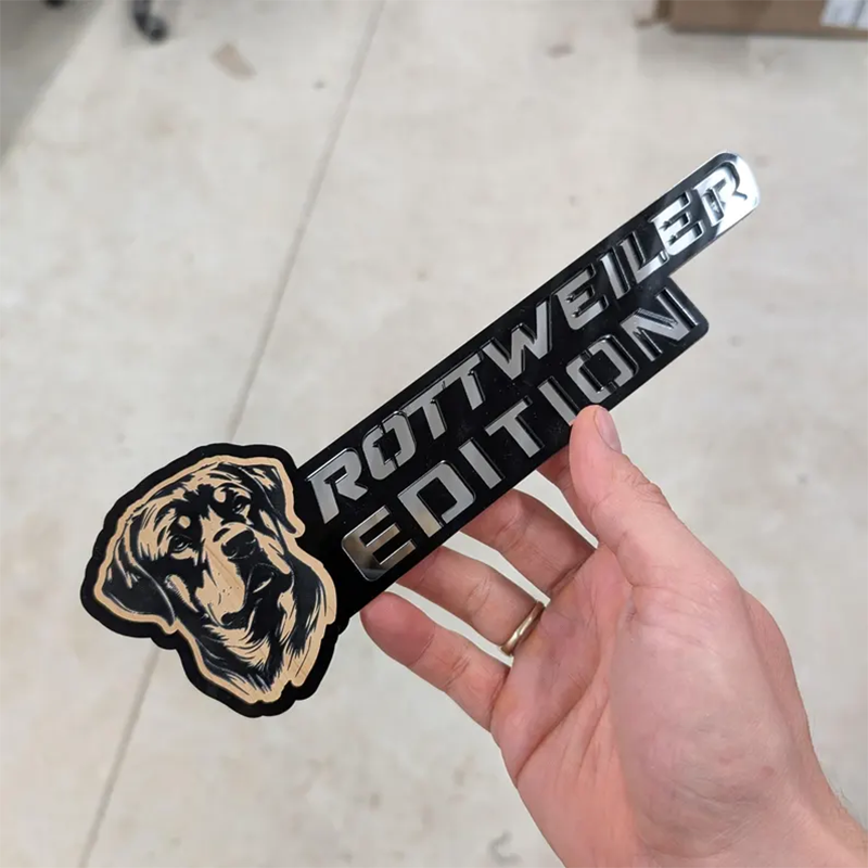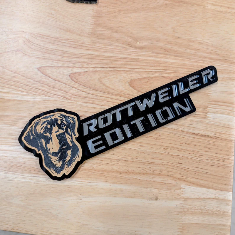 Your own custom Dog Edition car emblem! This badge is the perfect way to show your love for your doggo. This is not a boring, flat sticker that will fade in months or peel off; it is fully 3D, with high gloss black and mirror chrome like lettering.