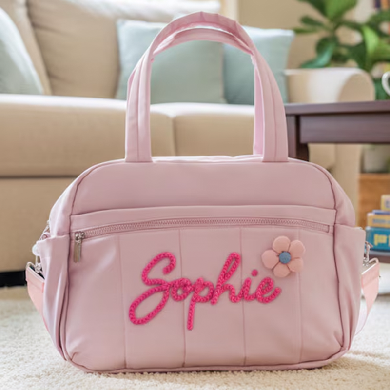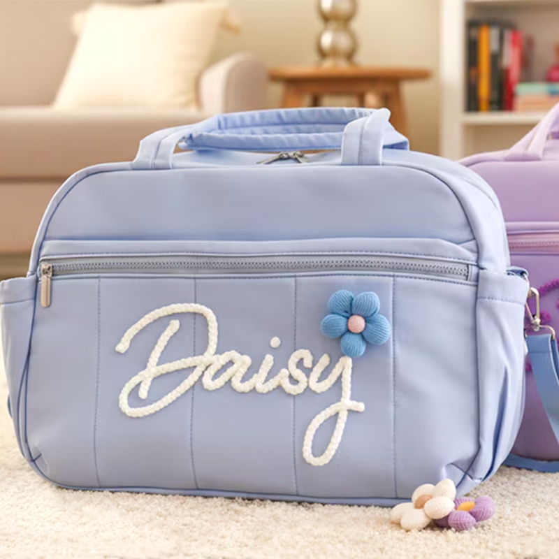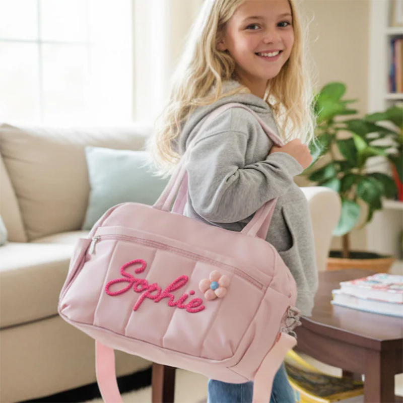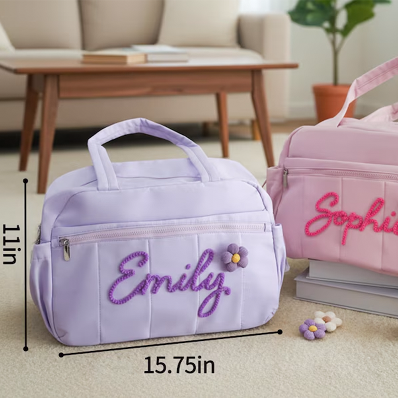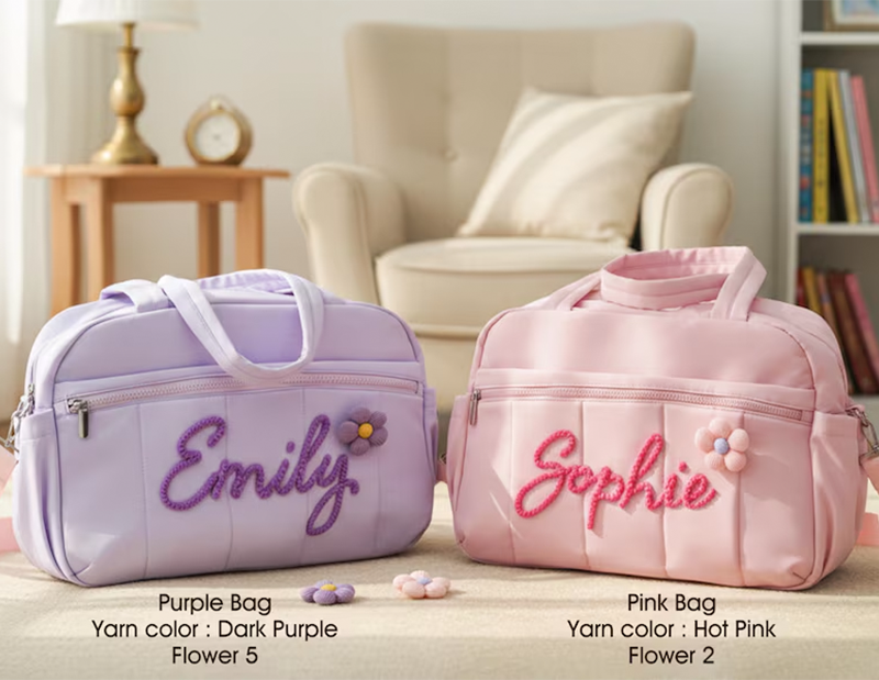 What makes this bag extra special? Her name is lovingly hand-crocheted from soft yarn and carefully attached to the bag, creating a beautiful, textured, and utterly unique look that you won't find in any store. This personalization ensures her bag stands out from the crowd and never gets lost in the gym!