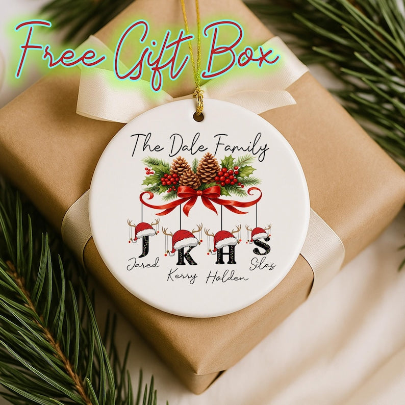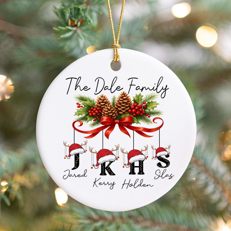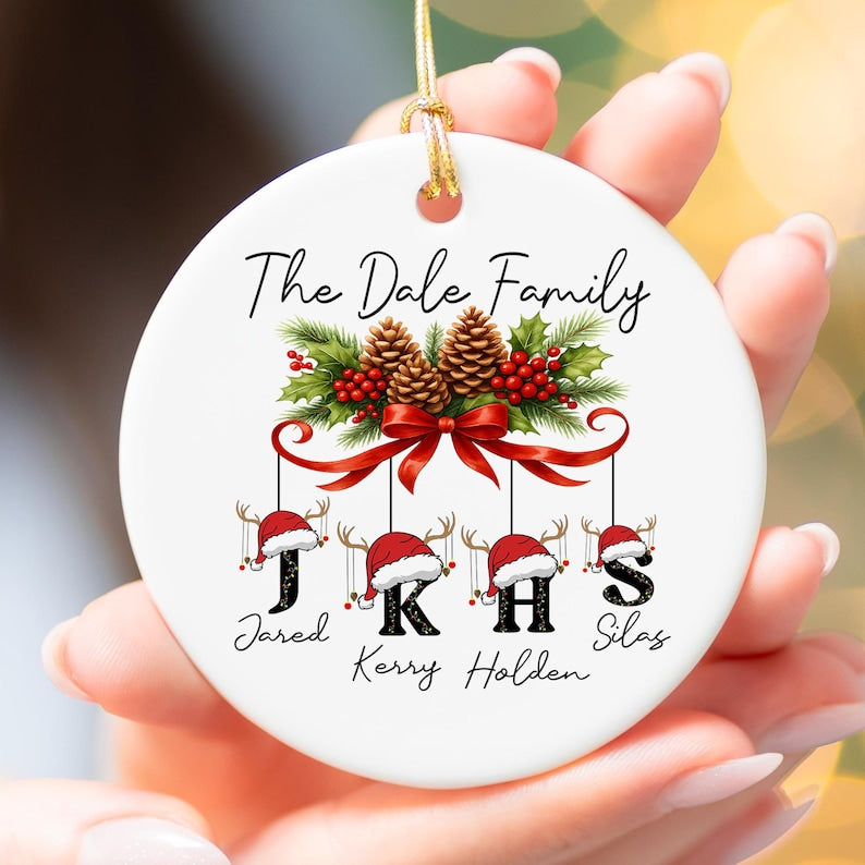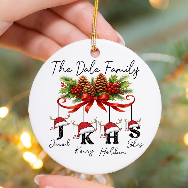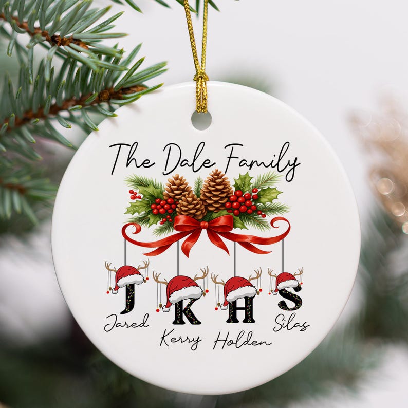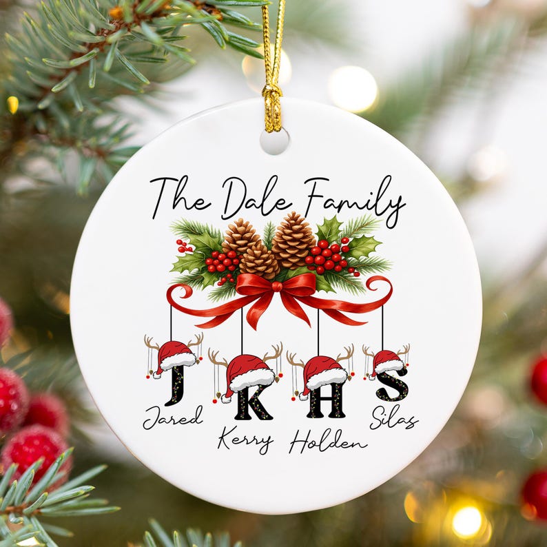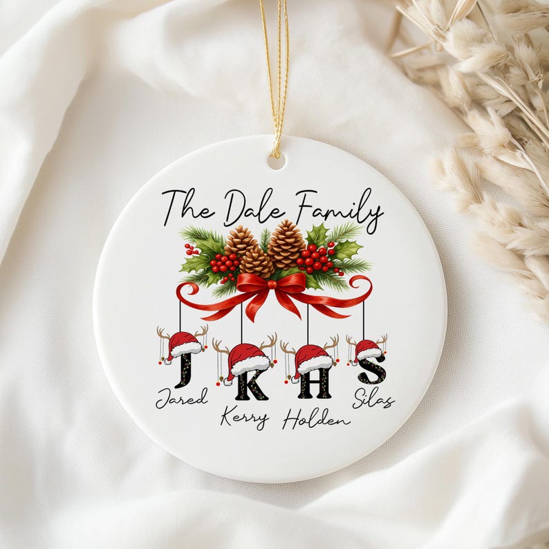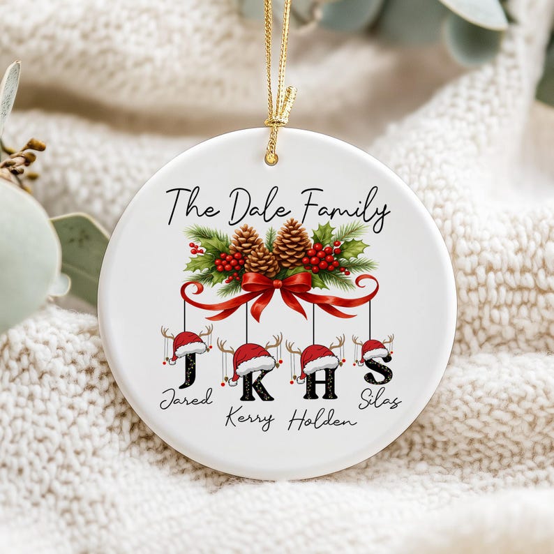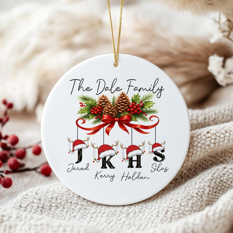 Celebrate the magic of Christmas with this beautifully personalized family ornament! Featuring your family's last name and each member's initials with festive hats and reindeer antlers, this ornament is the perfect keepsake for your tree or a heartfelt gift for loved ones.