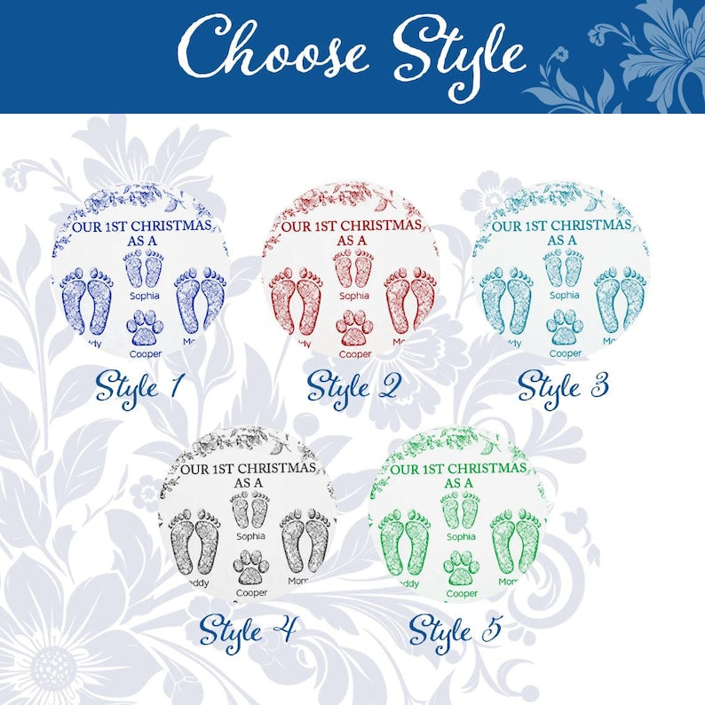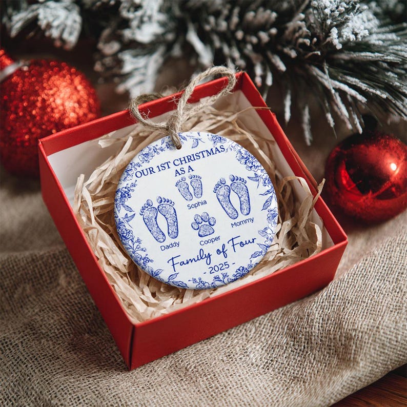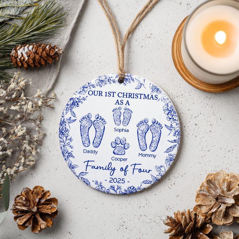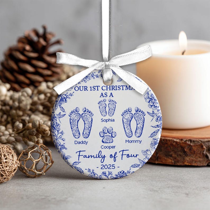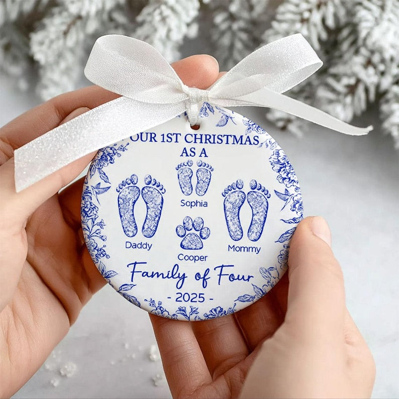 Create a memory that will last a lifetime with this personalized family Christmas ornament, designed to celebrate your very first holiday season as a family. Featuring a delicate blue Toile de Jouy floral border and custom footprint artwork, this keepsake beautifully represents each family member – Daddy, Mommy, child, and even a beloved pet – making it a touching reminder of the love and togetherness that defines your home.