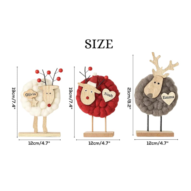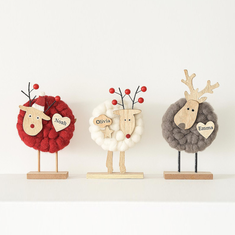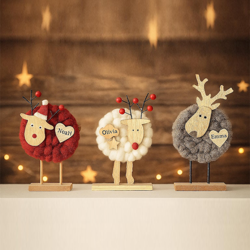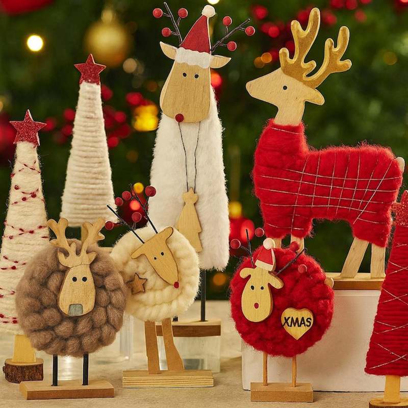 This charming Christmas decoration set brings a warm, handcrafted touch to your holiday display. Featuring wooden reindeer, cozy wool sheep, and yarn-wrapped Christmas trees topped with bright red stars, each piece blends rustic simplicity with festive cheer. The reindeer, with golden antlers and Santa accents, pair beautifully with the fluffy sheep adorned with playful details like stars and red noses. Soft textures of wool and yarn contrast with the natural wood bases, creating a cozy, Scandinavian-inspired aesthetic perfect for mantels, shelves, or table centerpieces. A delightful set that captures the spirit of Christmas in a whimsical, handmade style.