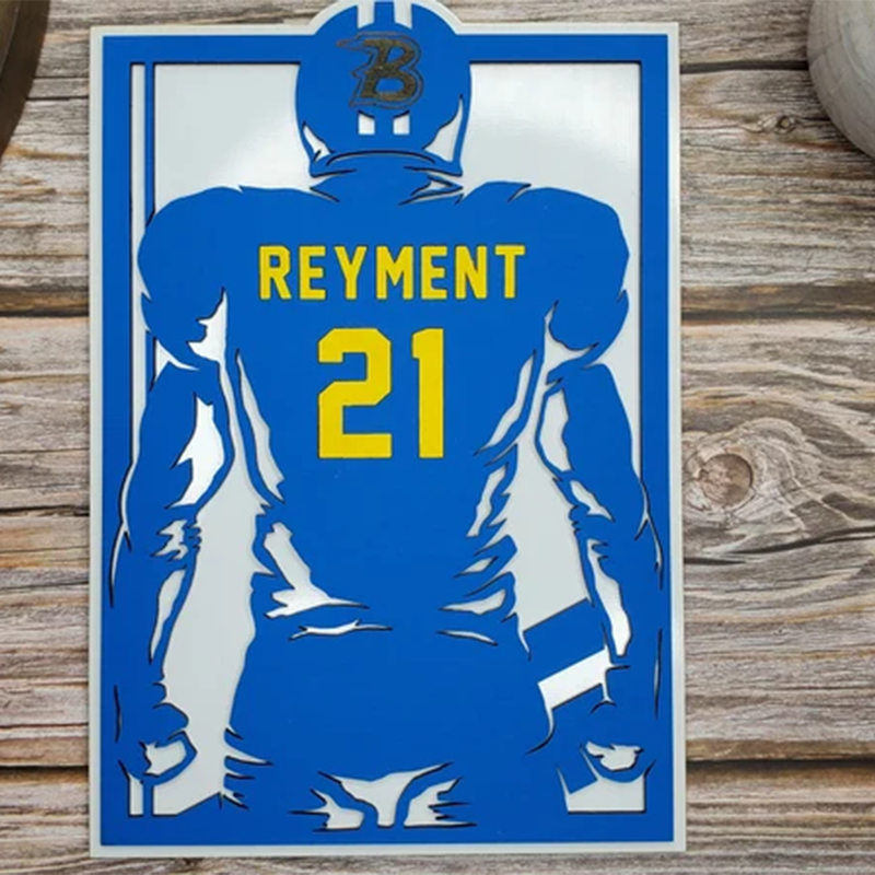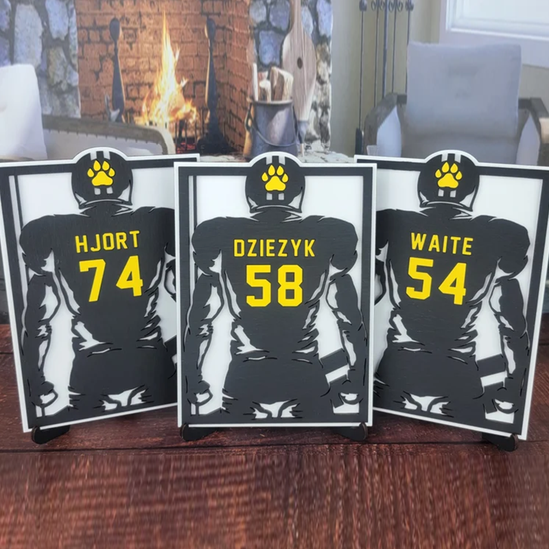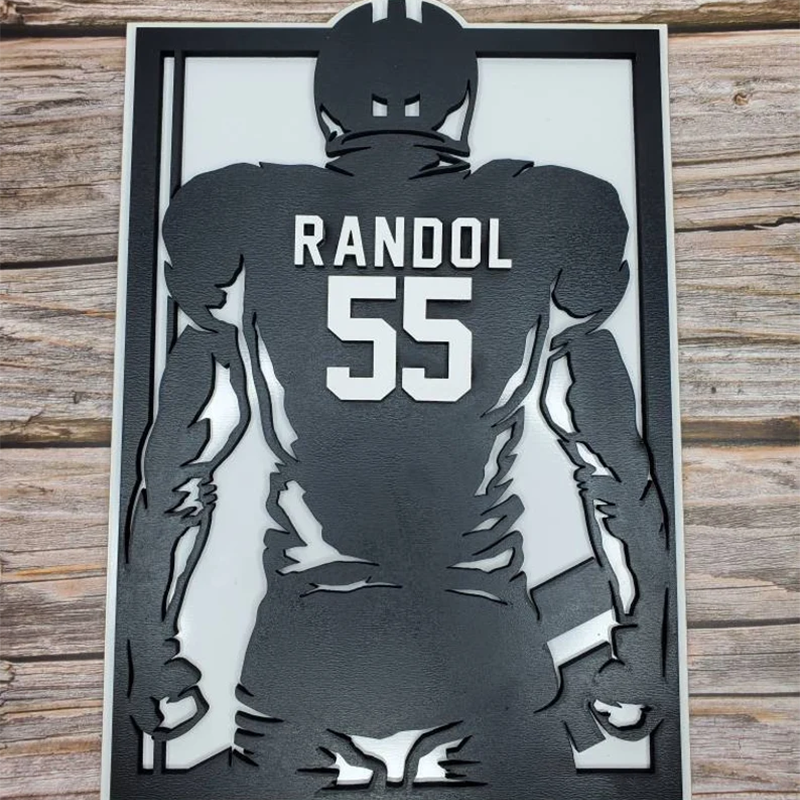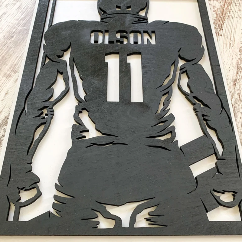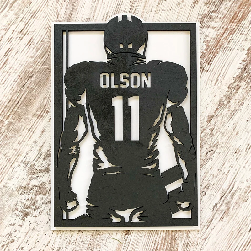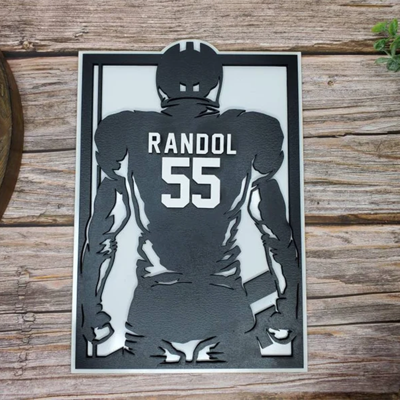 Score a touchdown with a personalized football player silhouette plaque! Show your support for your favorite player with a custom plaque featuring their name, number and team colors. Available in two sizes - Small (7" W x 10" T) and Large (10" W x 15" T) - you can choose the perfect fit for your space. Show off your team spirit and add a touch of style to your home, office, or sports room with this unique, two-layer plaque. Order yours today!"