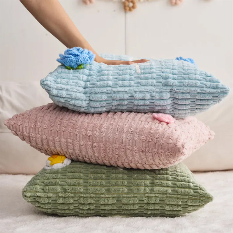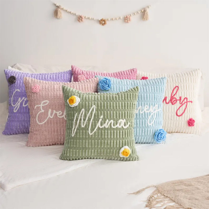 💖 Cozy up with this soft chenille pillow, personalized with any name sewn using plush chenille thread. Choose your pillowcase color, thread color, and one of over 10 handmade flower decorations. Made with gentle, durable materials safe for the whole family.
