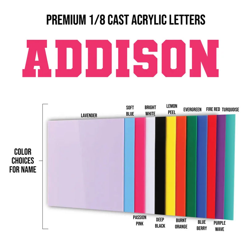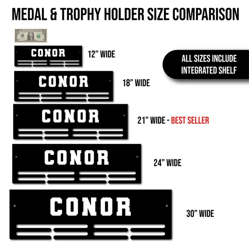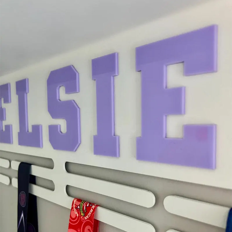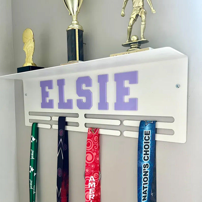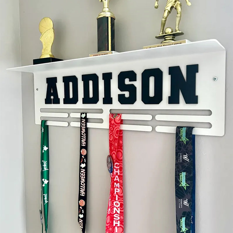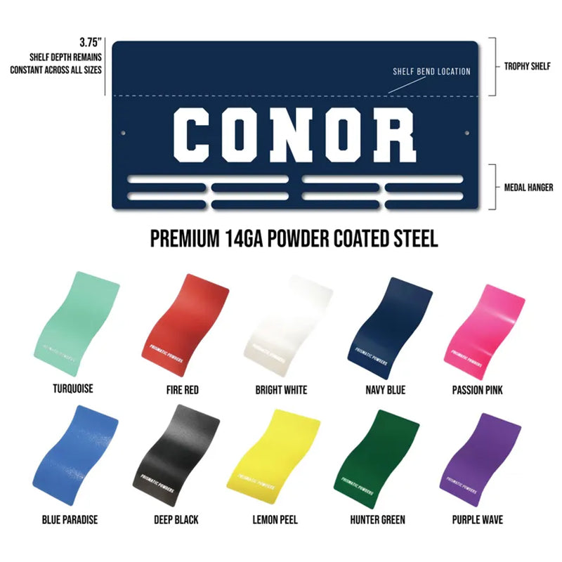 Celebrate your achievements with our custom medal hanger and trophy shelf display! Fabricated with thick, gauge steel, our medal and trophy holders are powder coated for a professional finished look. With an INTEGRATED SHELF, you can now display both trophies and medals with one statement piece! Choose from several colors of premium cast acrylic letters for your personalized name.