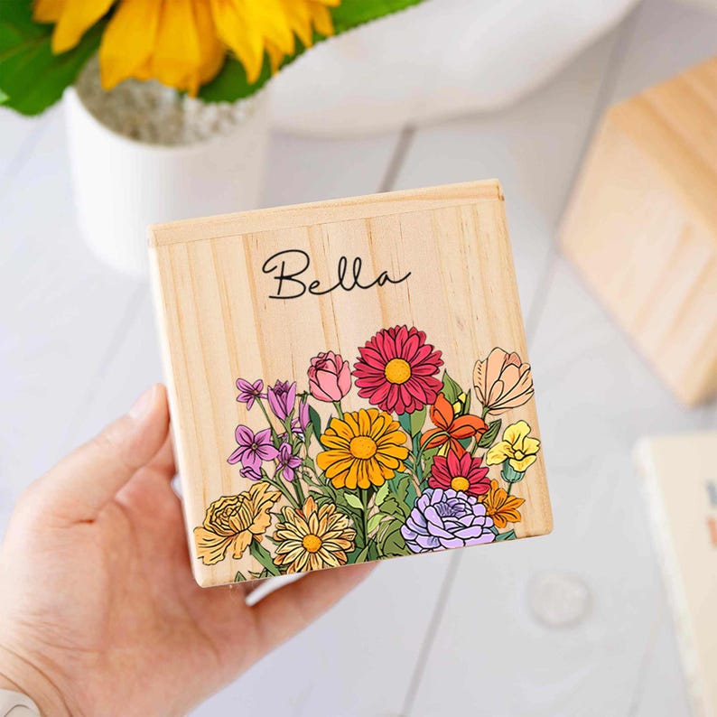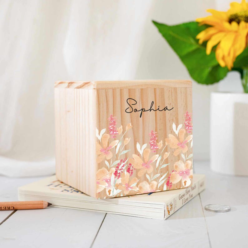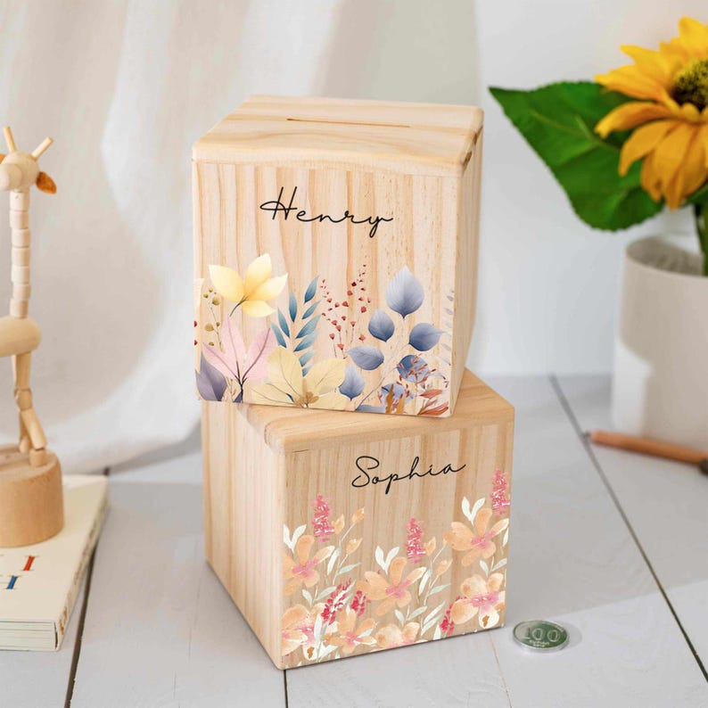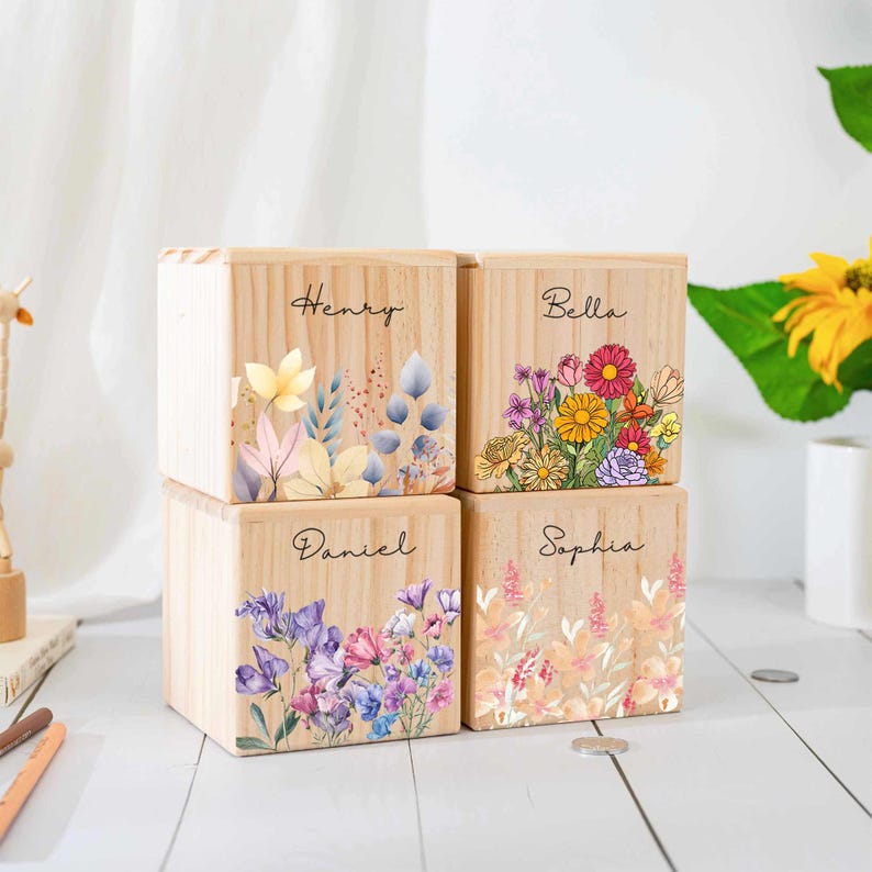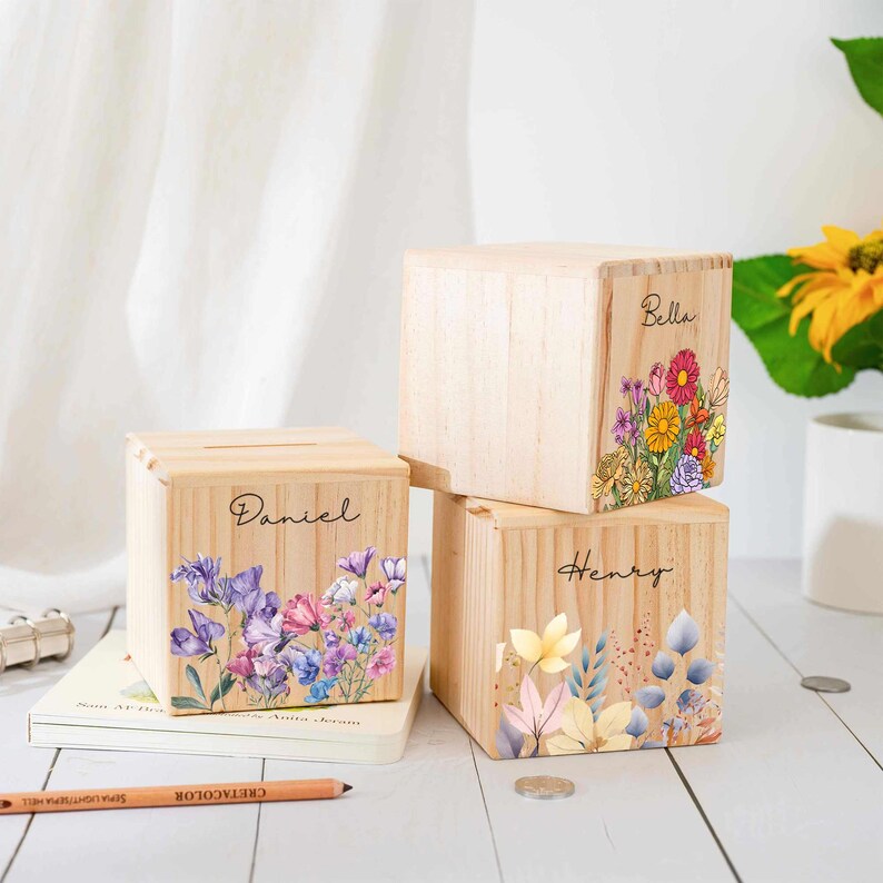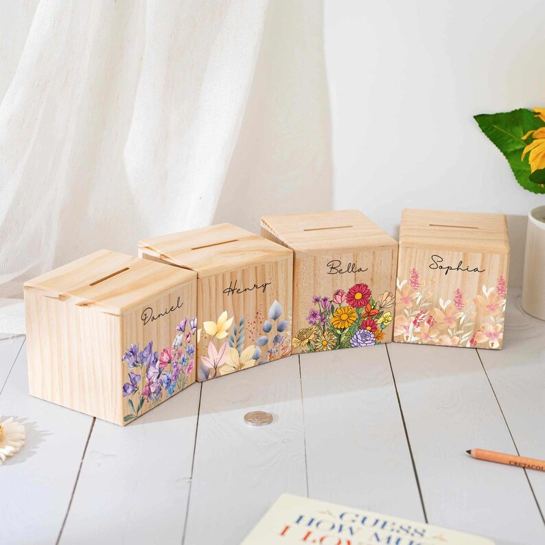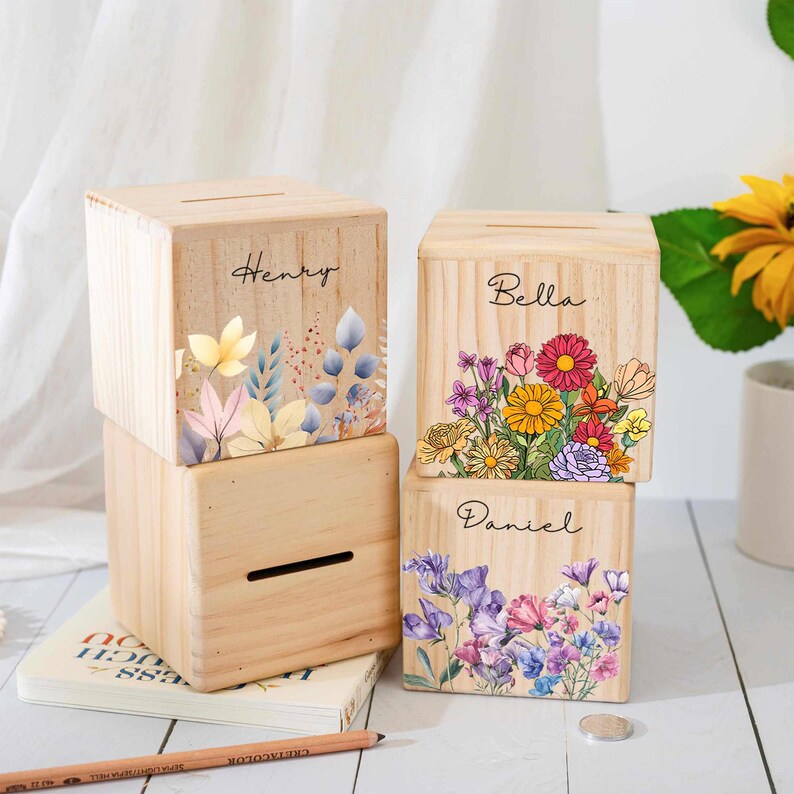 Custom Saving Bank with Kid Name, Flower Wooden Money Box Gift