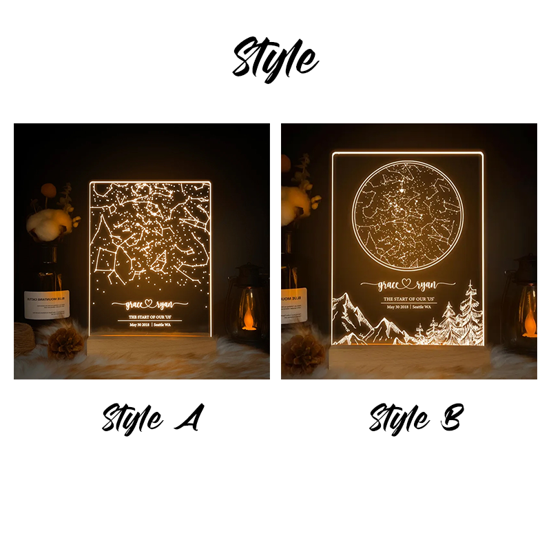 Capture the unforgettable moment when the stars aligned to transform your life forever with our unique star map designs. Our personalized creations are perfect for commemorating special occasions and adding a touch of celestial charm to any room. Delicately crafted with intricate detail, our night lights are truly works of art that will illuminate your space in more ways than one. Let the stars guide you through life's journey and light up even the darkest of times. Get your own custom star map today and cherish your memories for a lifetime!