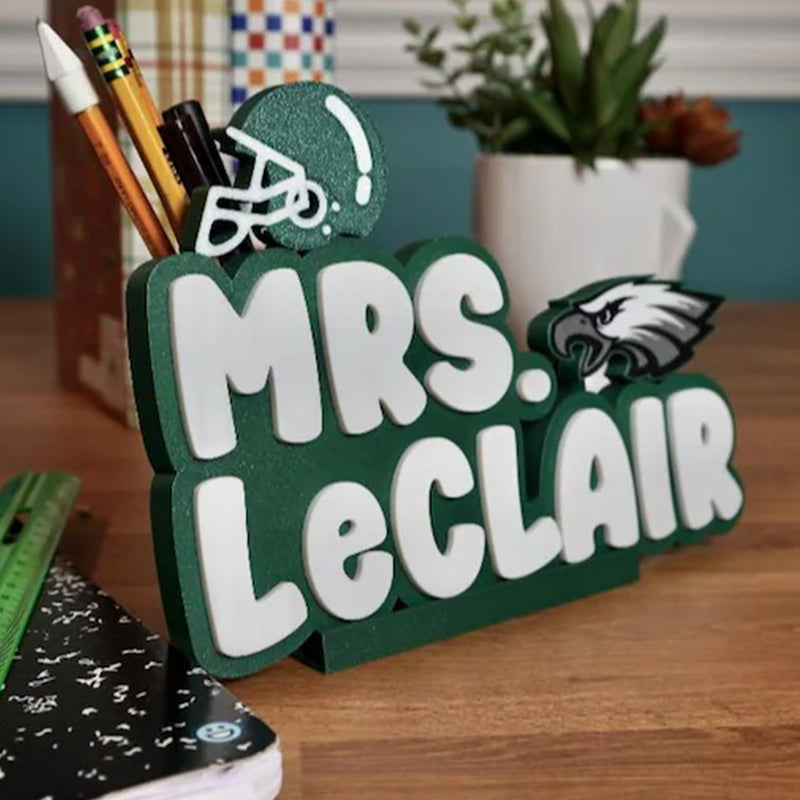 Show your team pride with this custom-made, 3D printed nameplate. Featuring the iconic team logo, this personalized piece is perfect for displaying on your desk, shelf, or anywhere you want to showcase your fandom