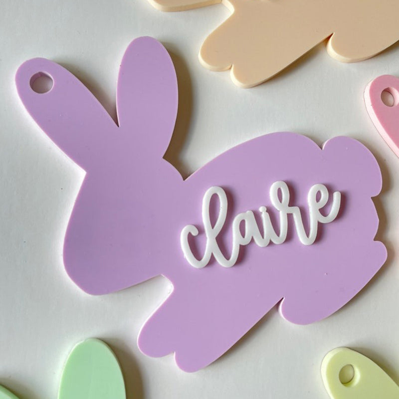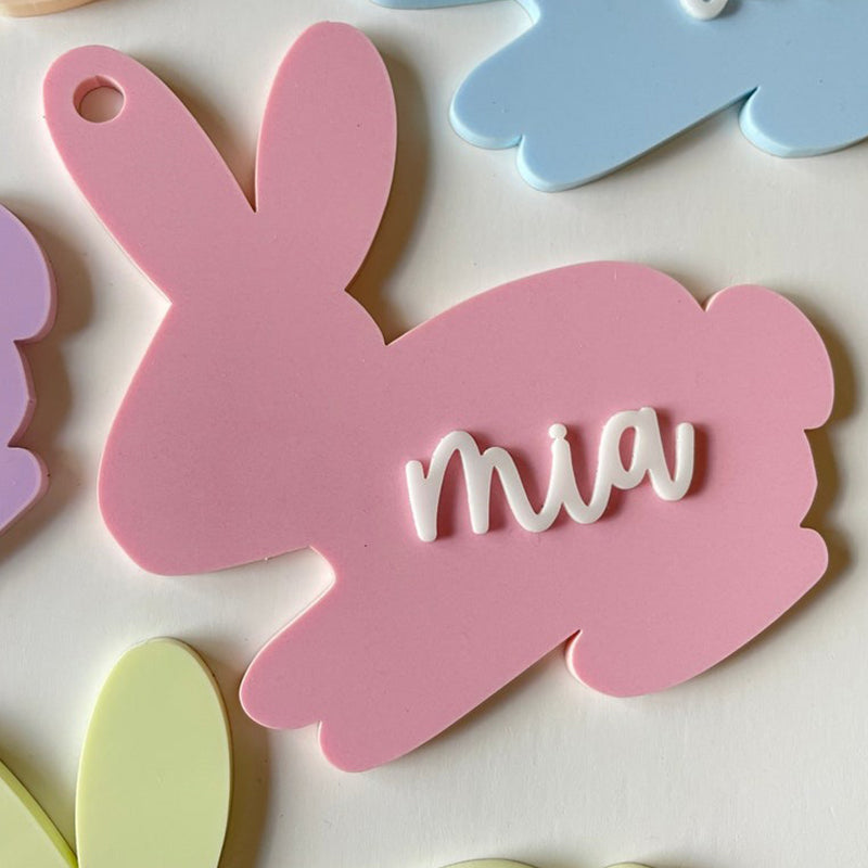 Names are cut from 1/16” white acrylic and glued onto the 1/8” acrylic bunny. All letters will be lowercase as shown on example bunnies. Names vary in size to fit each individual order.