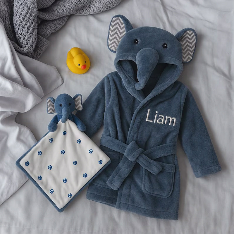 Delight in the soft touch and comfort of our versatile baby essentials, perfect for parents-to-be or new parents seeking practical and adorable items for their little ones. Our collection includes a cozy Security Blanket, Bathrobe, Pajamas, and Blanket, available individually or as a set. Each item has been thoughtfully designed to cater to your baby's needs, ensuring comfort, warmth, and a touch of whimsical cuteness.
