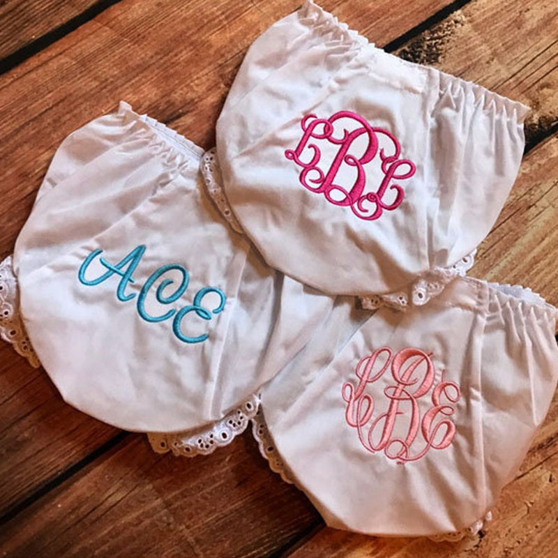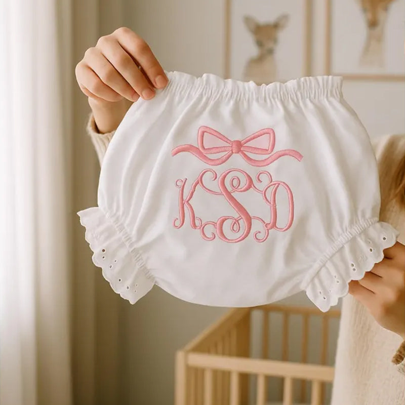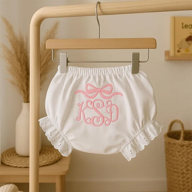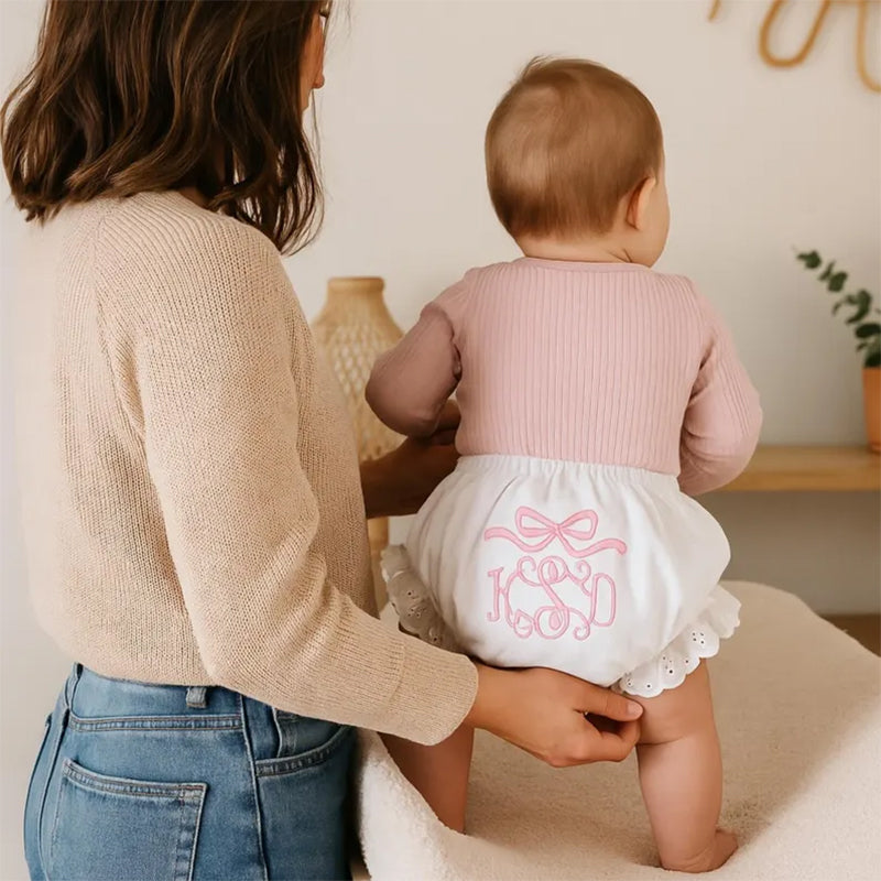 Introducing our adorable Monogrammed Baby Bloomers Diaper Cover with Eyelet Trim. You can make it a gift set adding the sweet Personalized Monogrammed Bib and Burp Cloth trimmed in a soft white ruffle. This gift will capture many hearts. Order now to create a cherished keepsake that celebrates your little one's style!