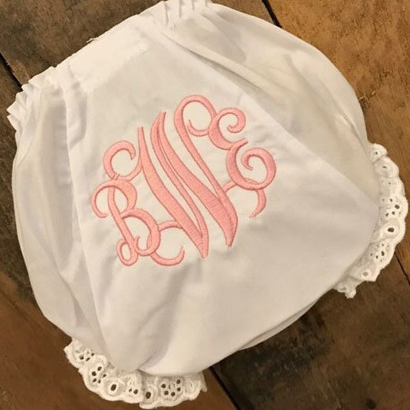 1. MONOGRAMMED DETAILES: PLEASE LIST LETTERS IN THE ORDER YOU WANT THEM EMBROIDERED ON THE BLOOMERS. WE WILL NOT MESSAGE YOU TO CONFIRM. Traditional Monogram Placement by order: First Initial is Left of Center, Last Name Initial in Center, and Middle Initial is placed Right of Center.