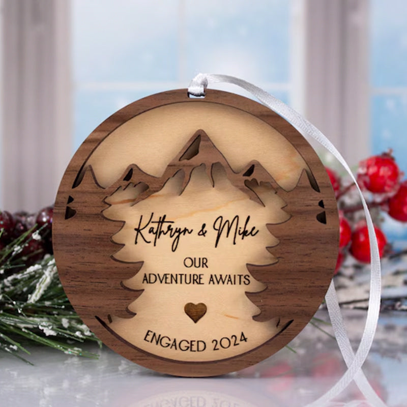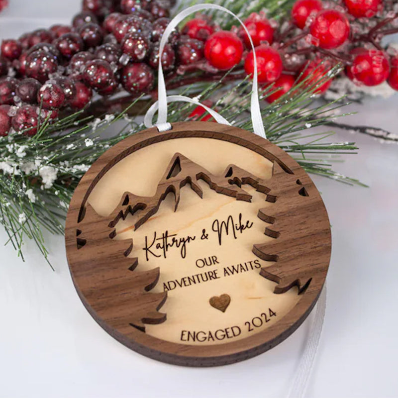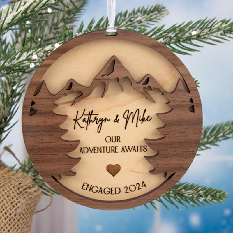 A beautiful 3D ornament featuring mountains and trees along with the phrase "Our Adventure Awaits", the names of the couple celebrating their first Christmas as an engaged couple, and the current year (2025).