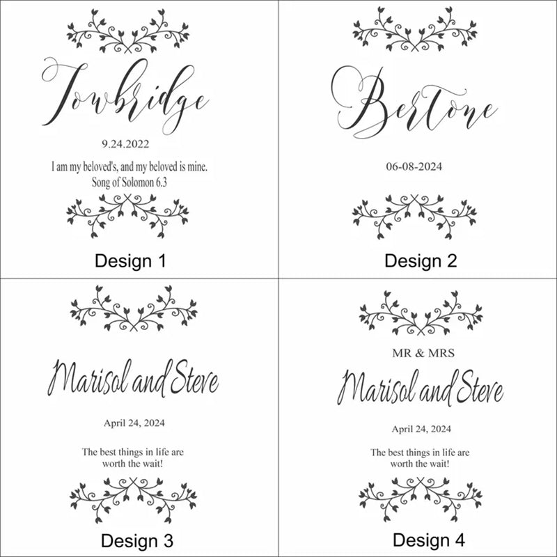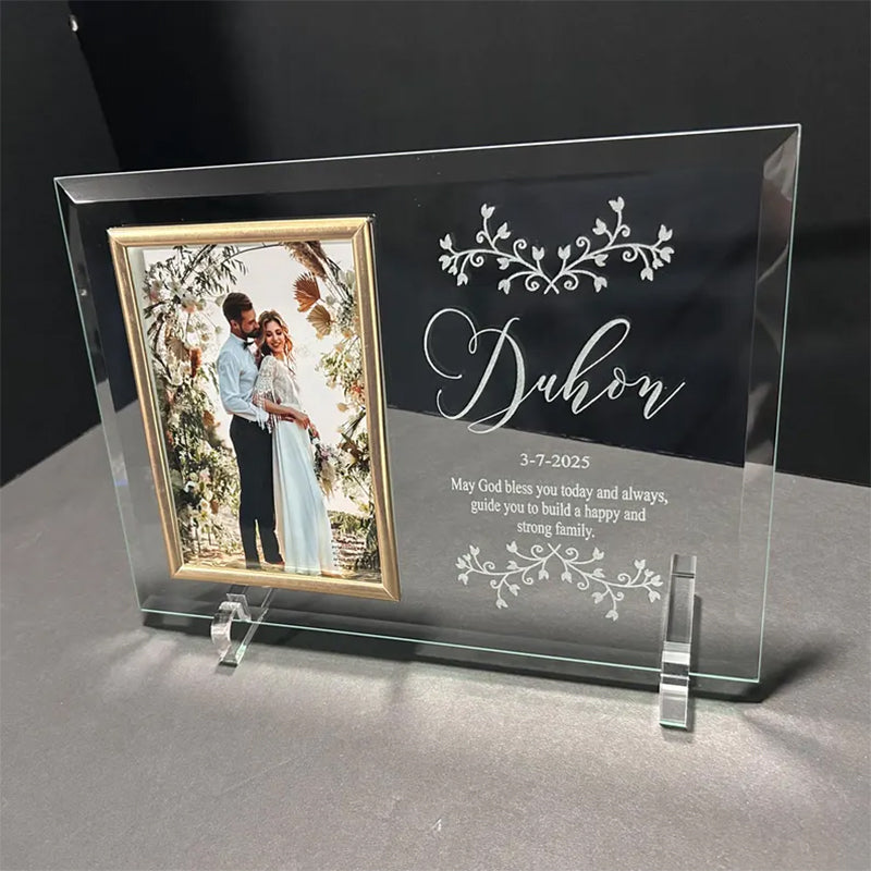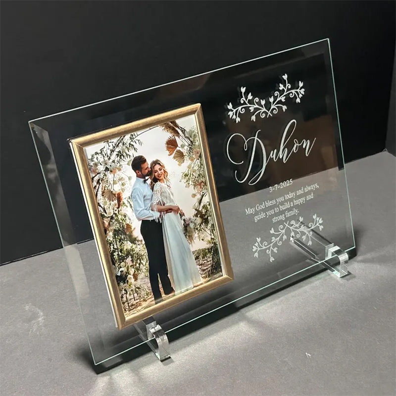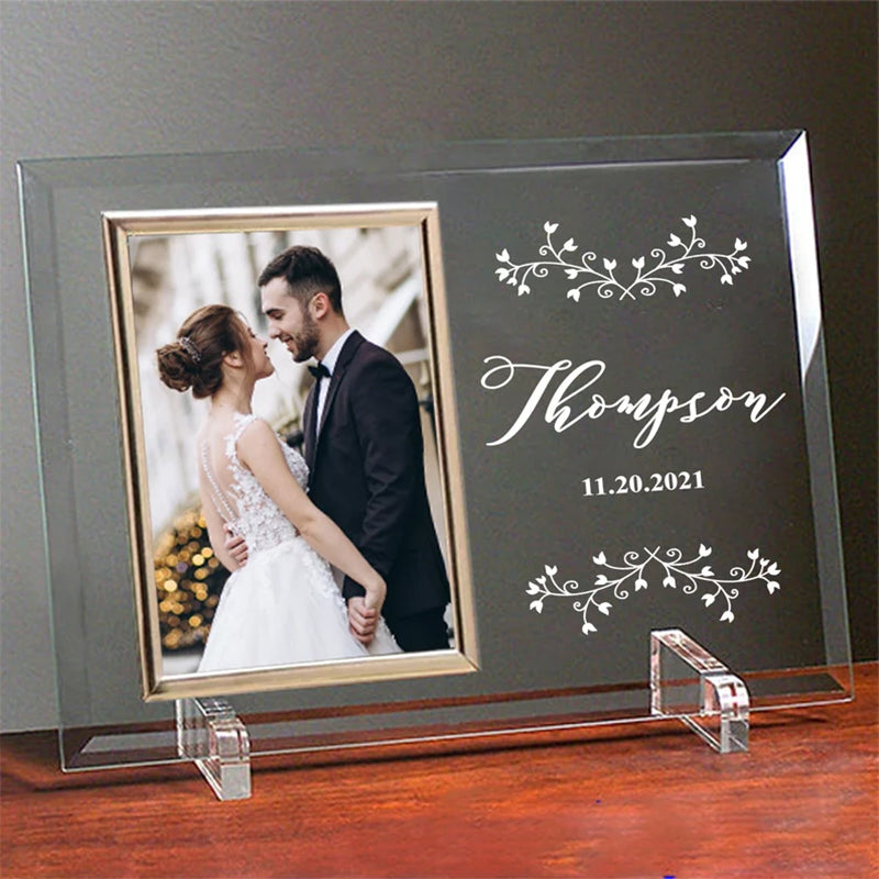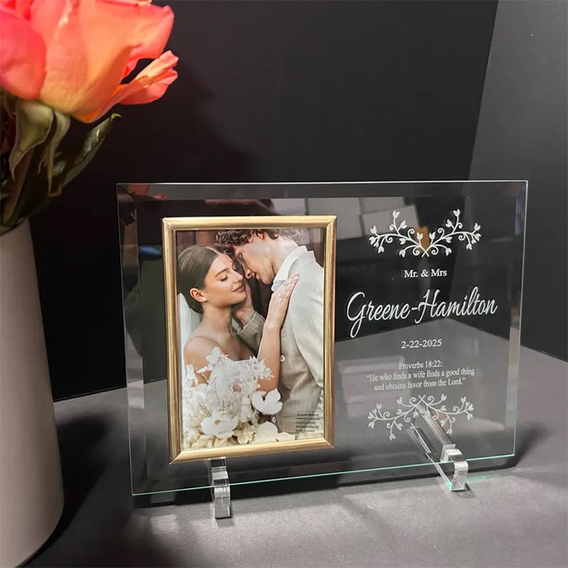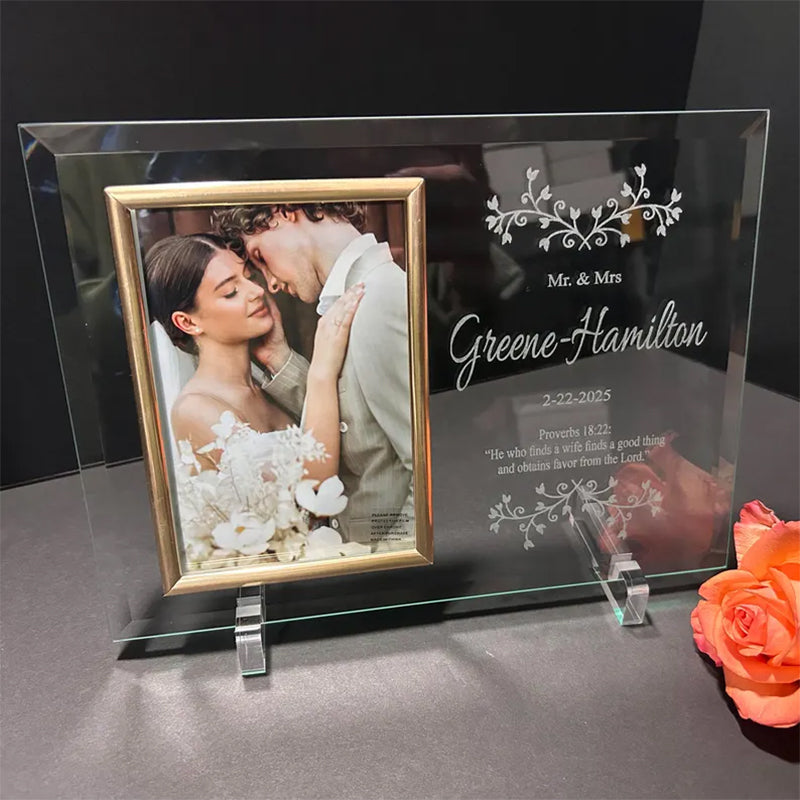 For this beautiful wedding picture frame in the personalize section enter the couple's last name, their wedding date and a small message for the couple.