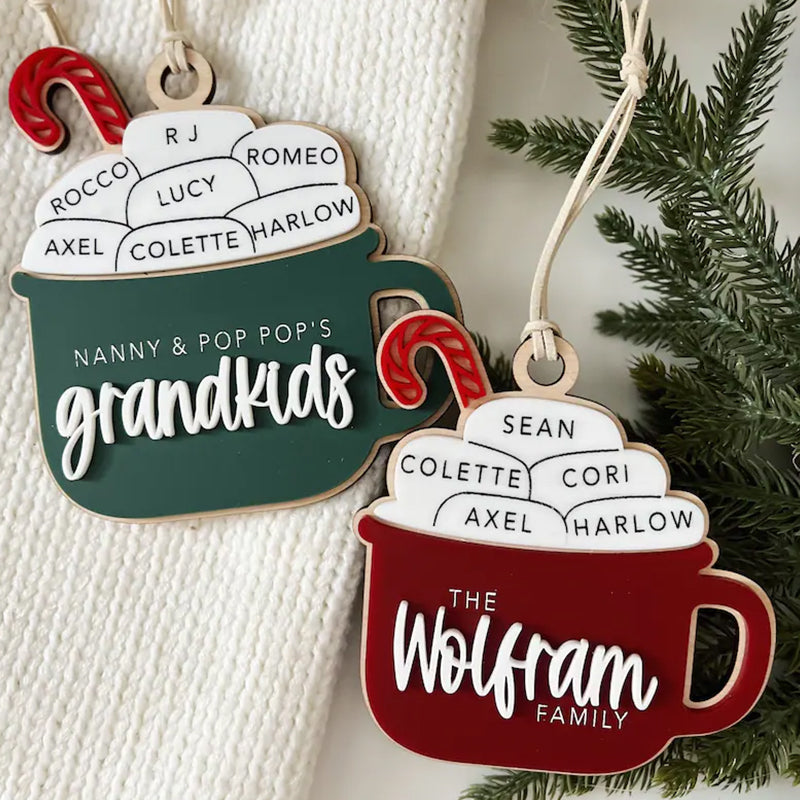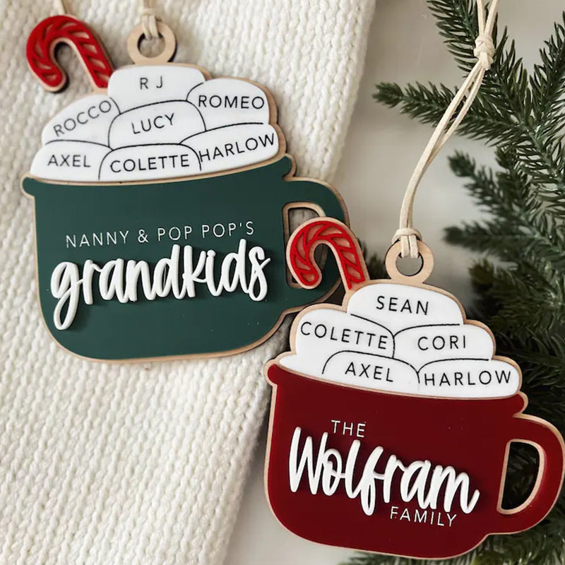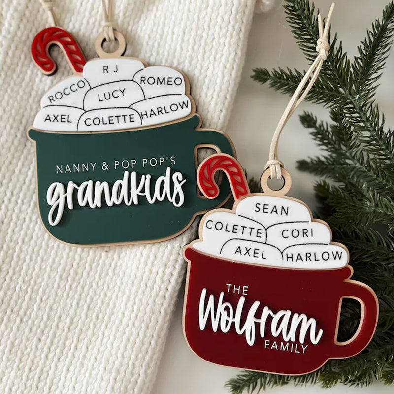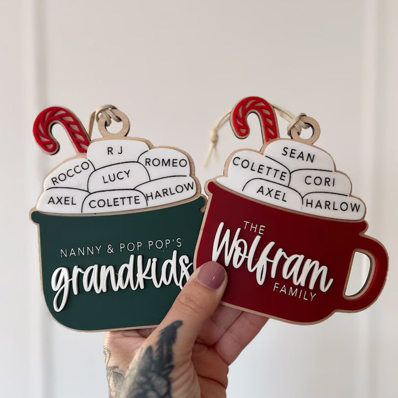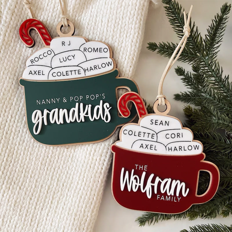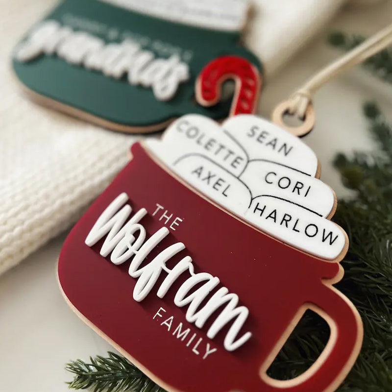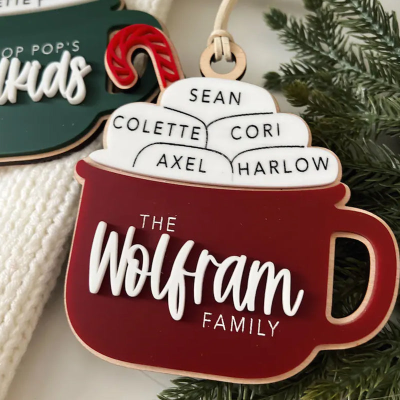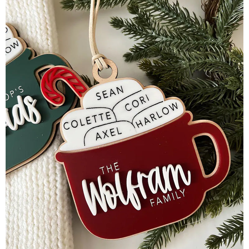 This family ornament cant feature up to 8 names with a personalization of your choice. Each mug will come with a combination of engraved lettering and 3D acrylic lettering.