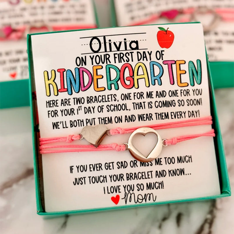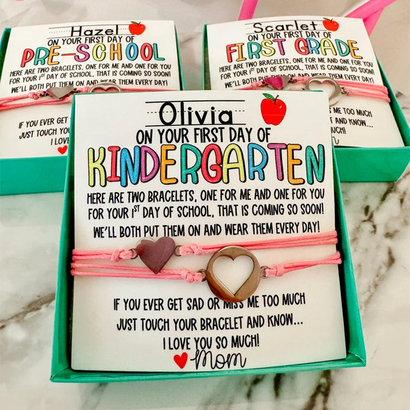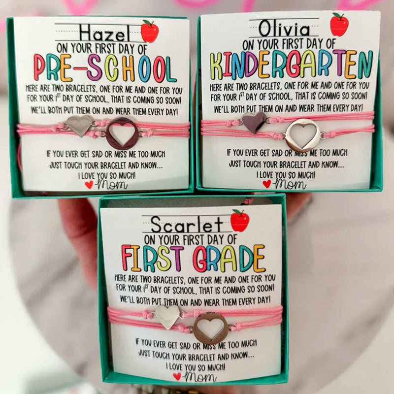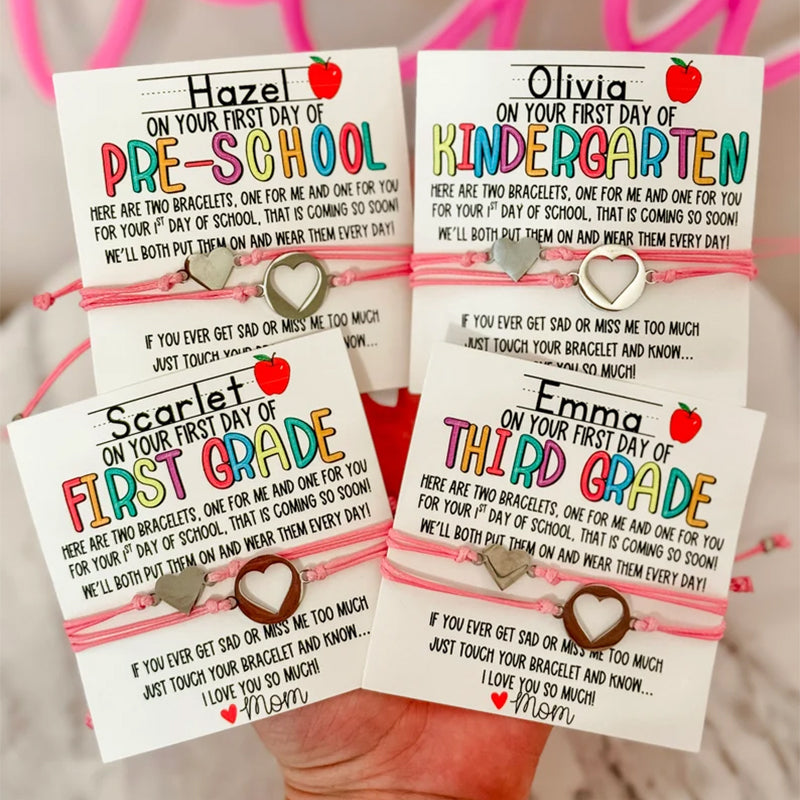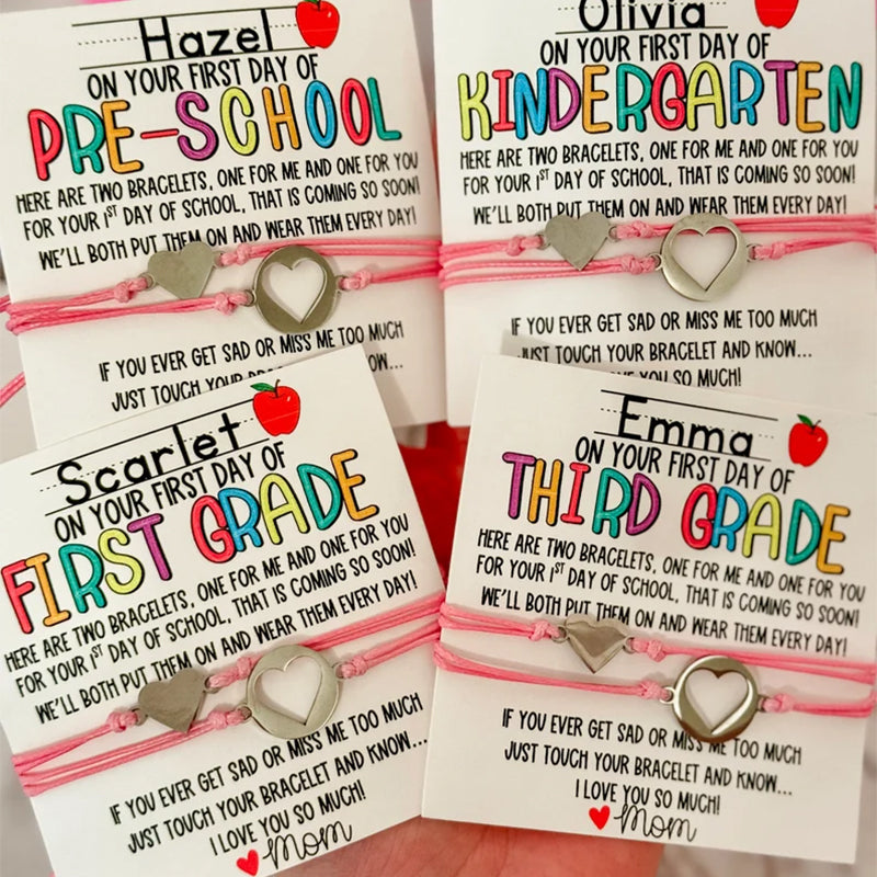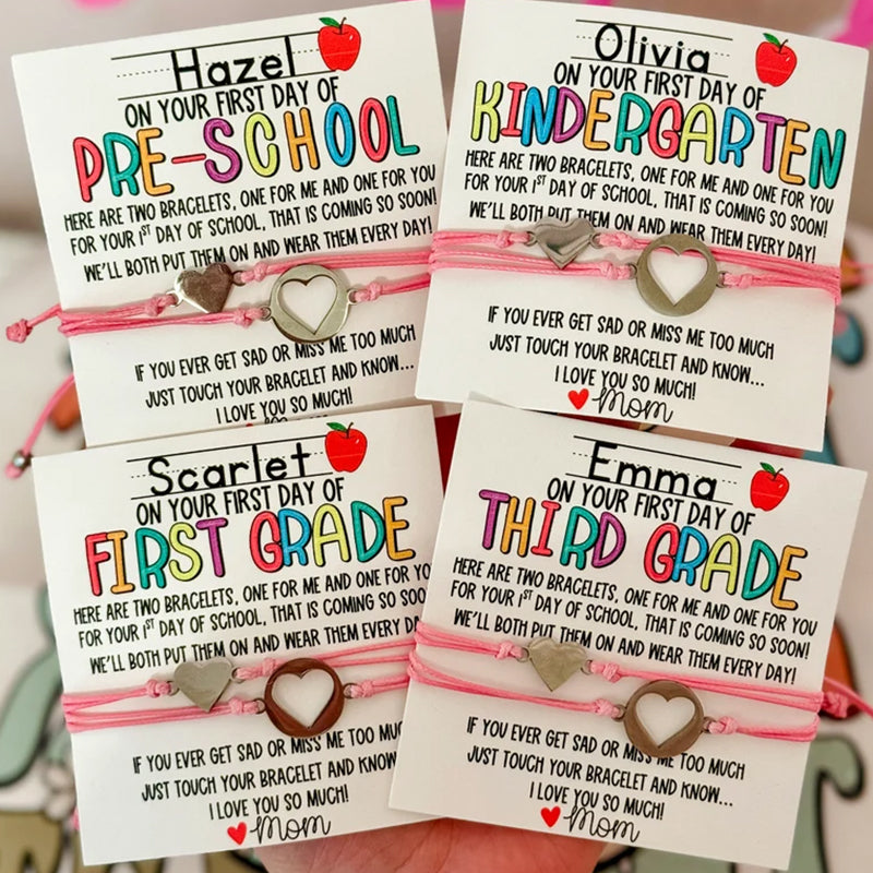 Text on the Card: Name, Here are two bracelets, one for me and one for you. For your 1st day of school that is coming so soon! We'll both put them on and wear them every day! If you ever get sad or miss me too much, just touch your bracelet and know.... I LOVE YOU SO MUCH! Love, Mom