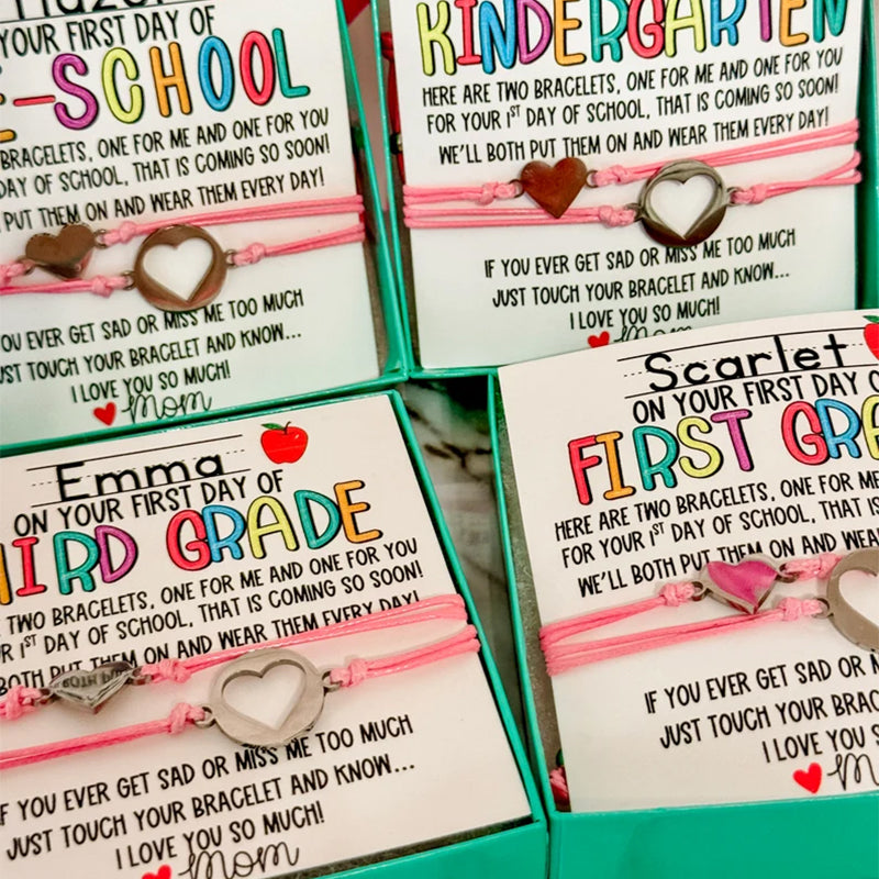 Use this gift for a first day of school or first day of school surprise! They will look down and see their bracelet and know you have yours on thinking about them too! This set compliments each other and is fashion forward to match any outfit.