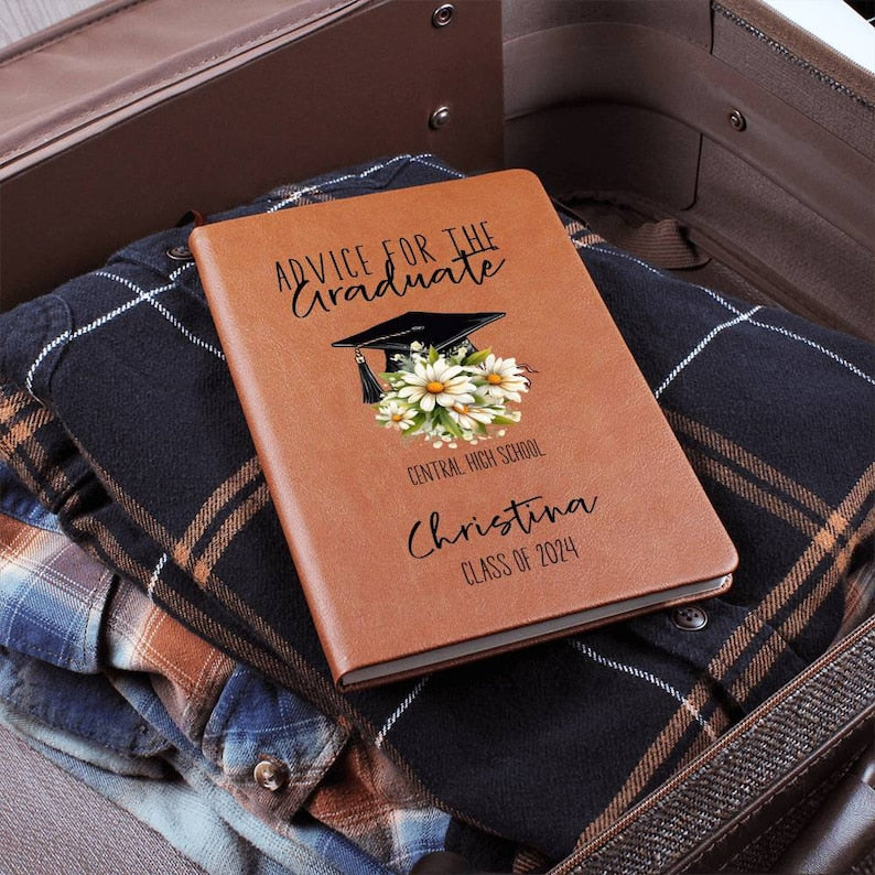 Graphic Leather Journal: Ideal for personal notes and goal-setting, this lightweight vegan leather journal is perfect for on-the-go writing. With a ribbon bookmark and elastic closure for easy navigation, the professionally printed vibrant front ensures durability. Stay organized and stylish with this versatile journal.