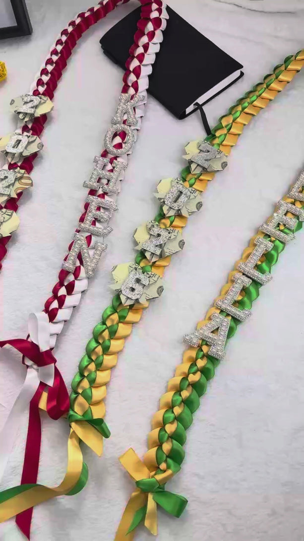 This handmade origami lei is made with satin ribbons & embroidered letters & rhinestone numbers with bling to match school colors. Our leis are the perfect gift for your graduate or for any other special occasion!. The lei is approx 36-40 inches in length.