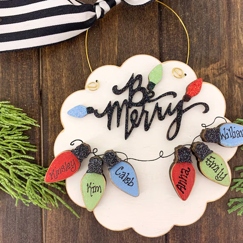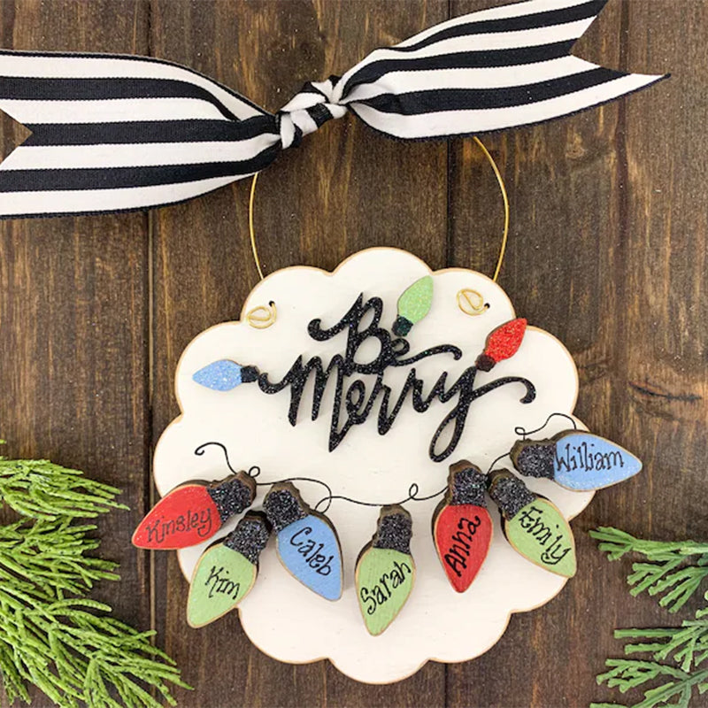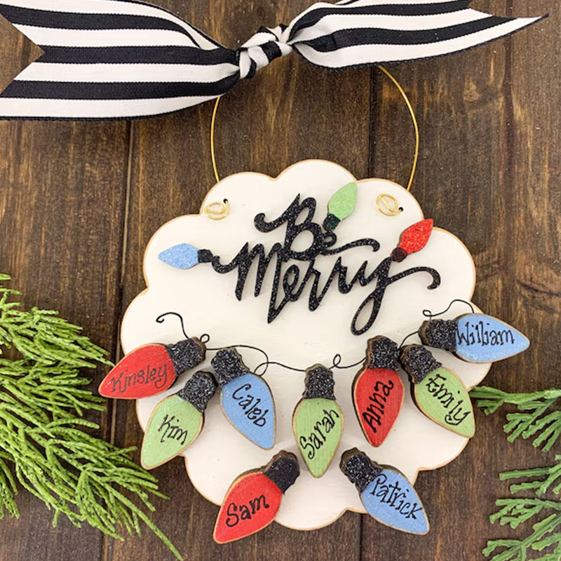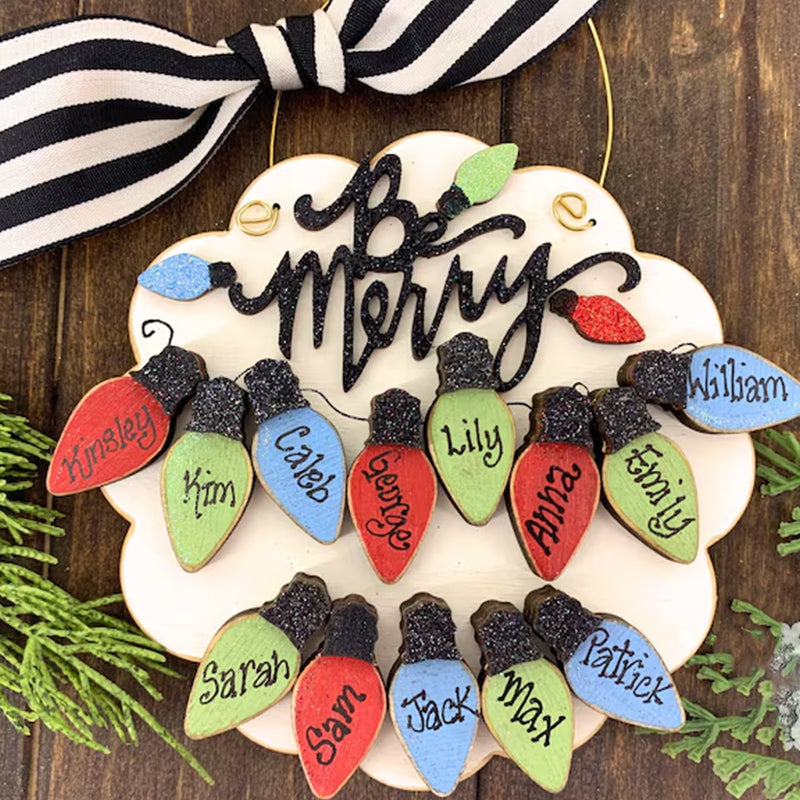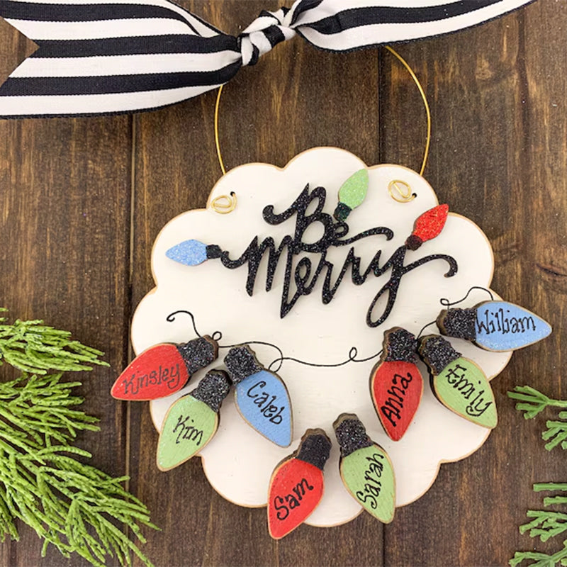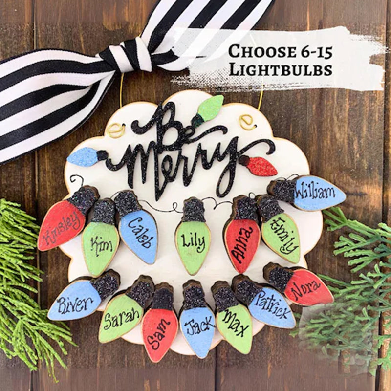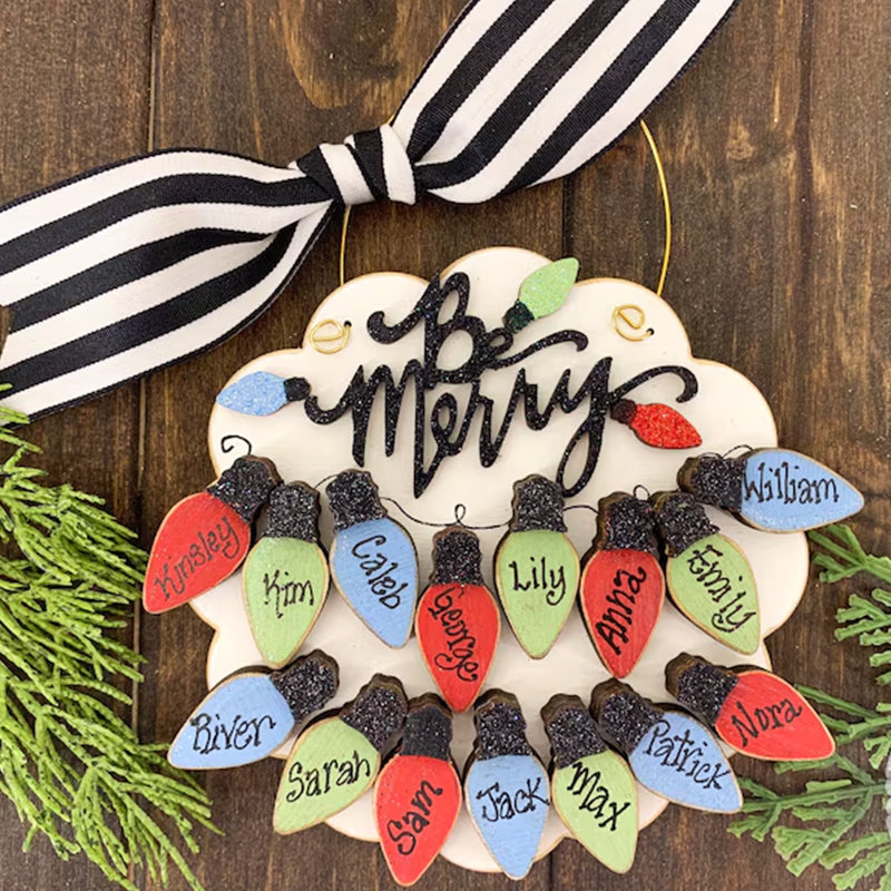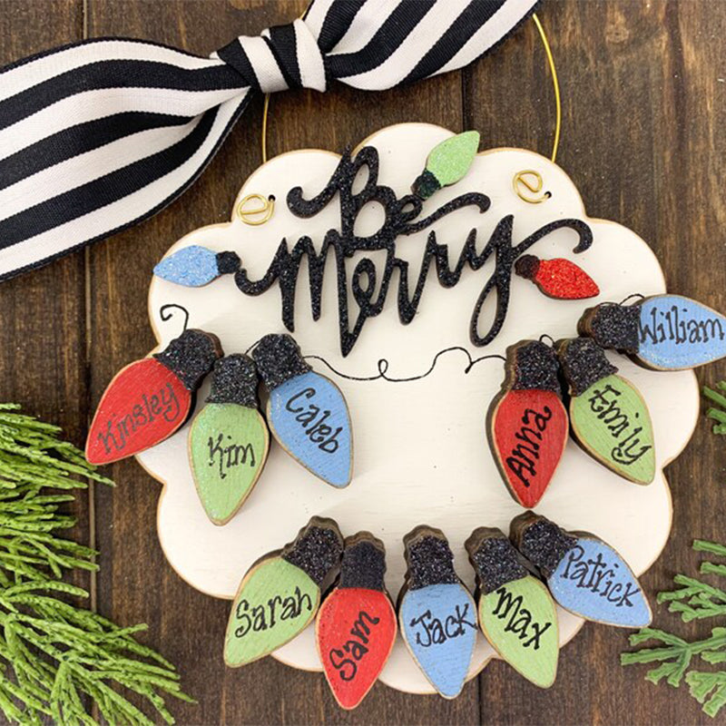 Let us personalize this showstopper to create the most cherished gift you'll give this year! All the festive wood Christmas lights are connected by a hand painted "string" and feature hand carved edging, fully glittered layered tops, and may be personalized per your request. The perfect family ornament, grandparent gift or festive representation of any large group!