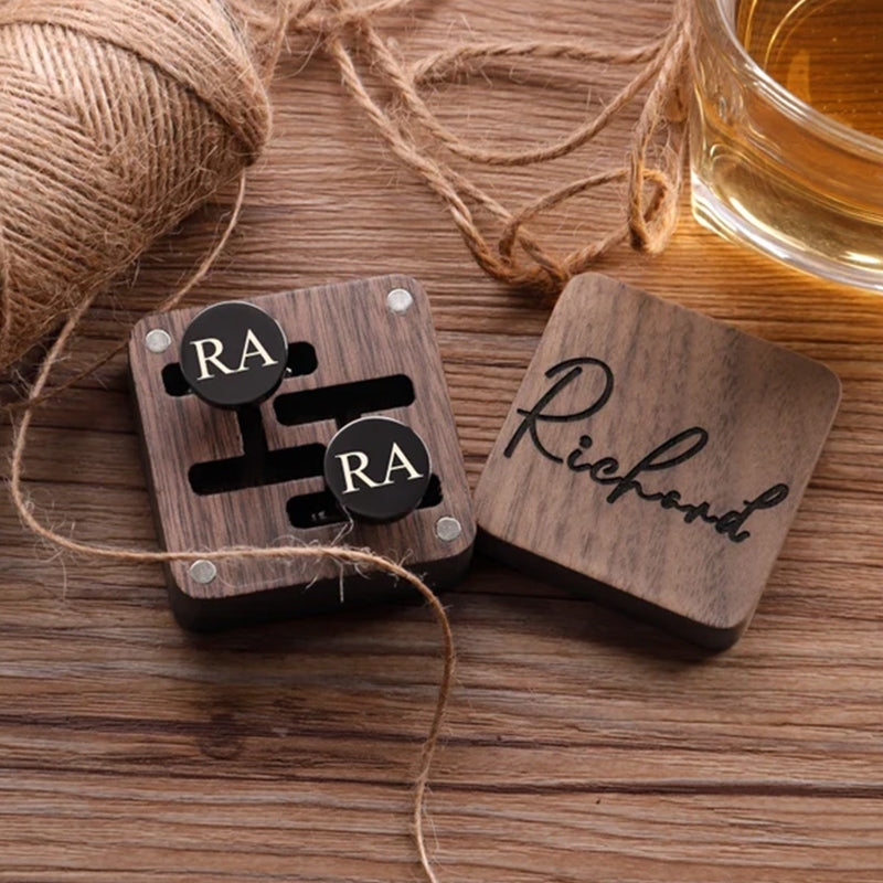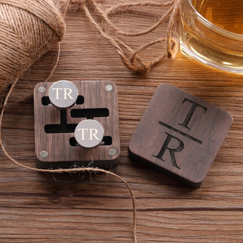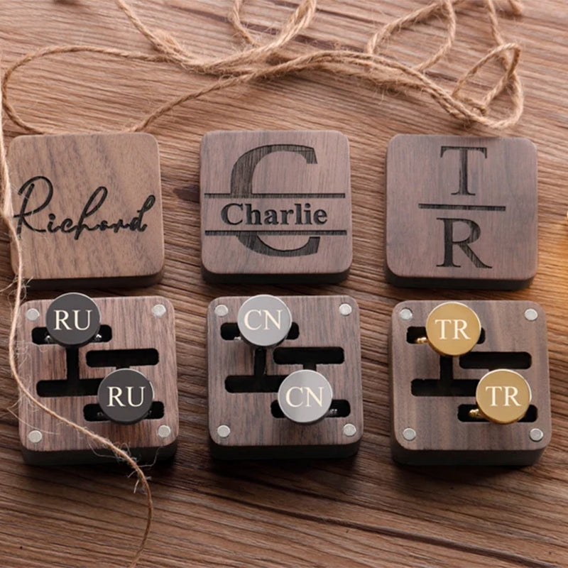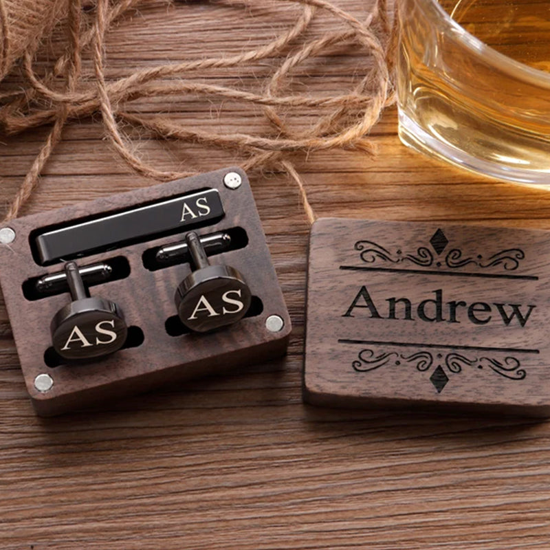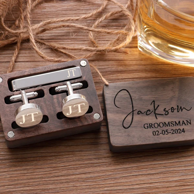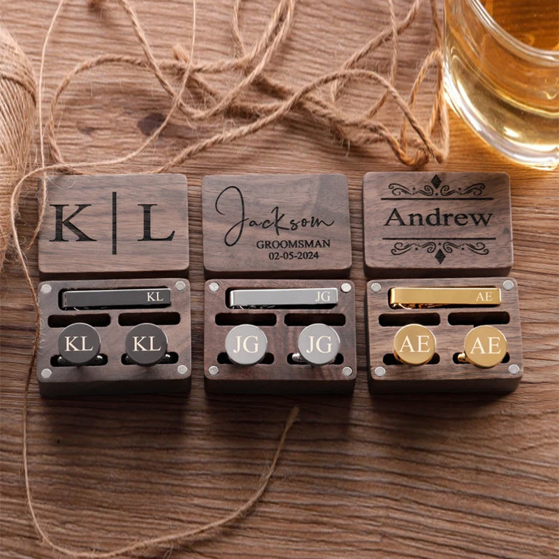 These cufflinks and tie clips with wooden boxes can be personalized to your requirements with names, initials, wedding dates.