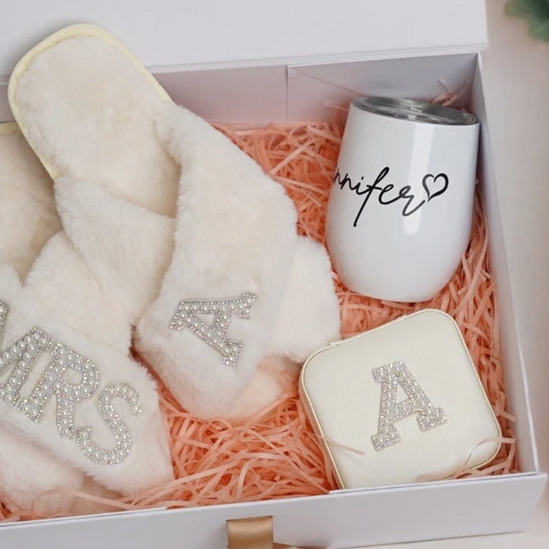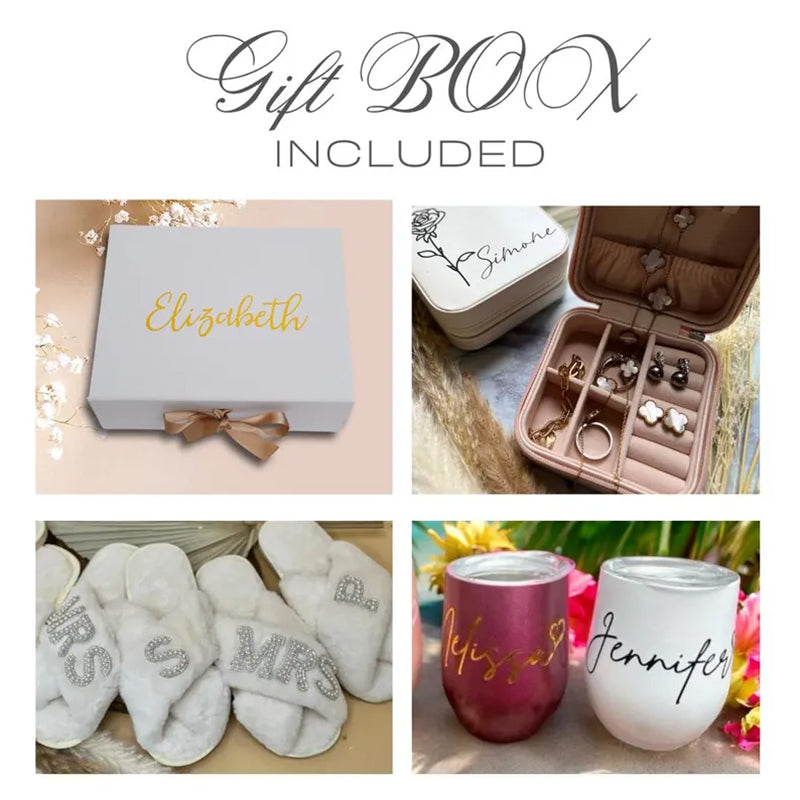 Custom name premium quality white gift box with gold ribbon, White color tumbler, ivory fluffy sleepers, white jewelry box (all personalized)