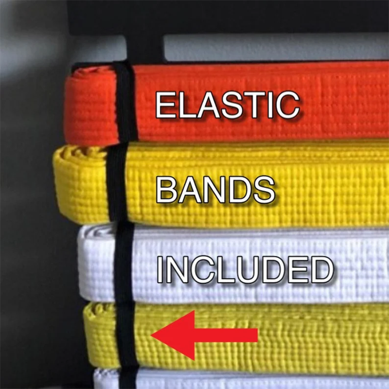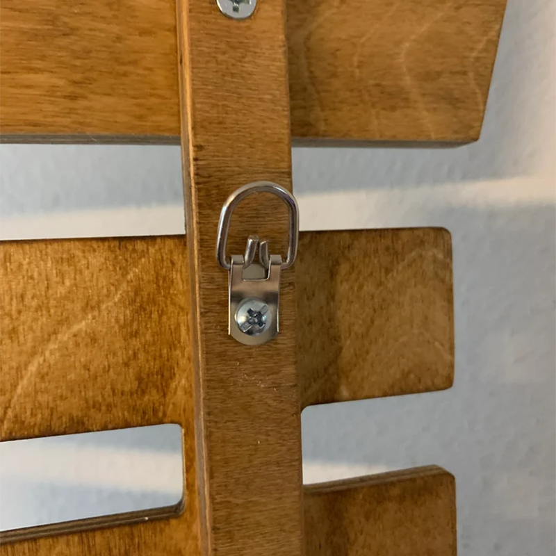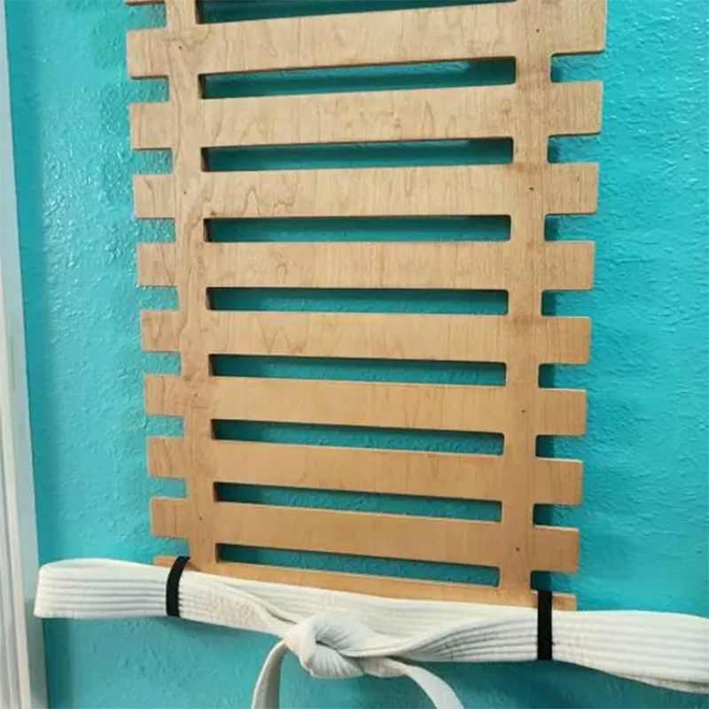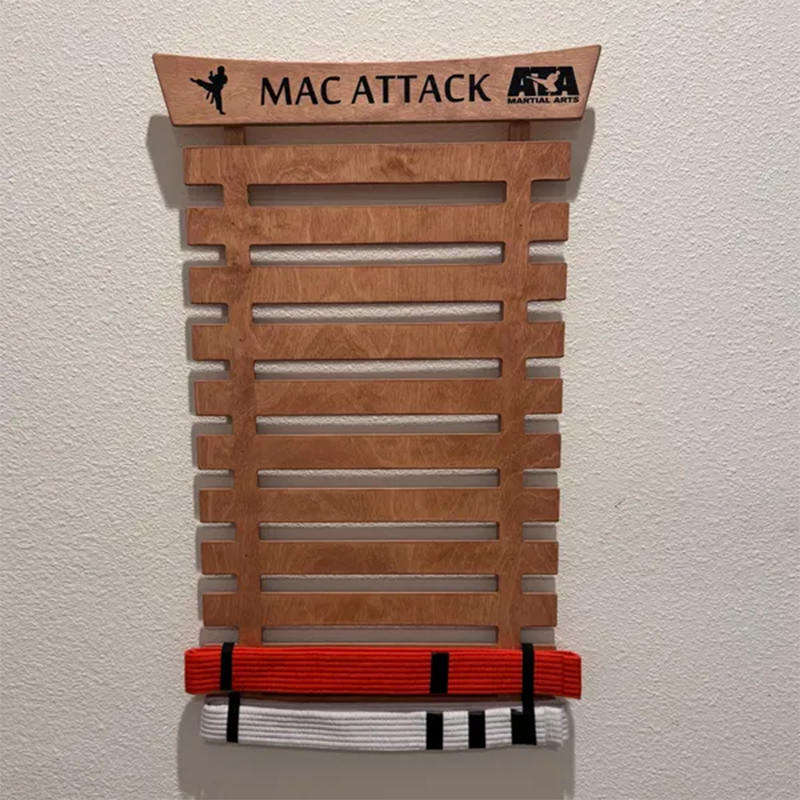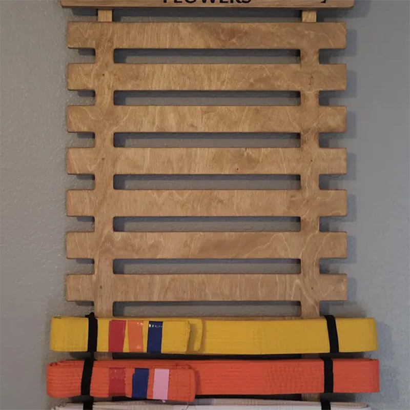 Our belt racks are made from 1/4” Baltic birch plywood using a CNC machine. The name header is attached separately to allow it to be laser engraved if desired. Elastic bands used to hold each belt onto the belt rack will be included but in a separate bag (be careful not to throw them out with the box). These are not attached to the belt rack so that they can be added as belts are earned. Two metal D ring hooks will be attached to the back for easy hanging. **Please note that the belt rack can be heavy and care should be taken when hanging or affixing to a wall. It is not recommended to hang in an area where it could possibly fall and injure someone such as over a bed or chair. Wall anchors are recommended when no studs are available to affix to.