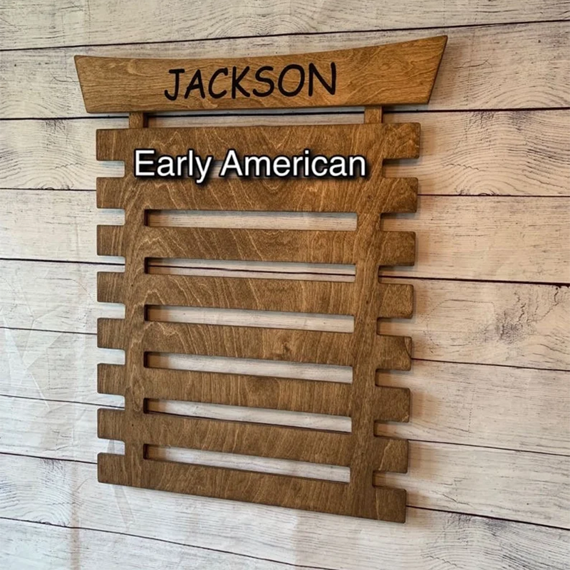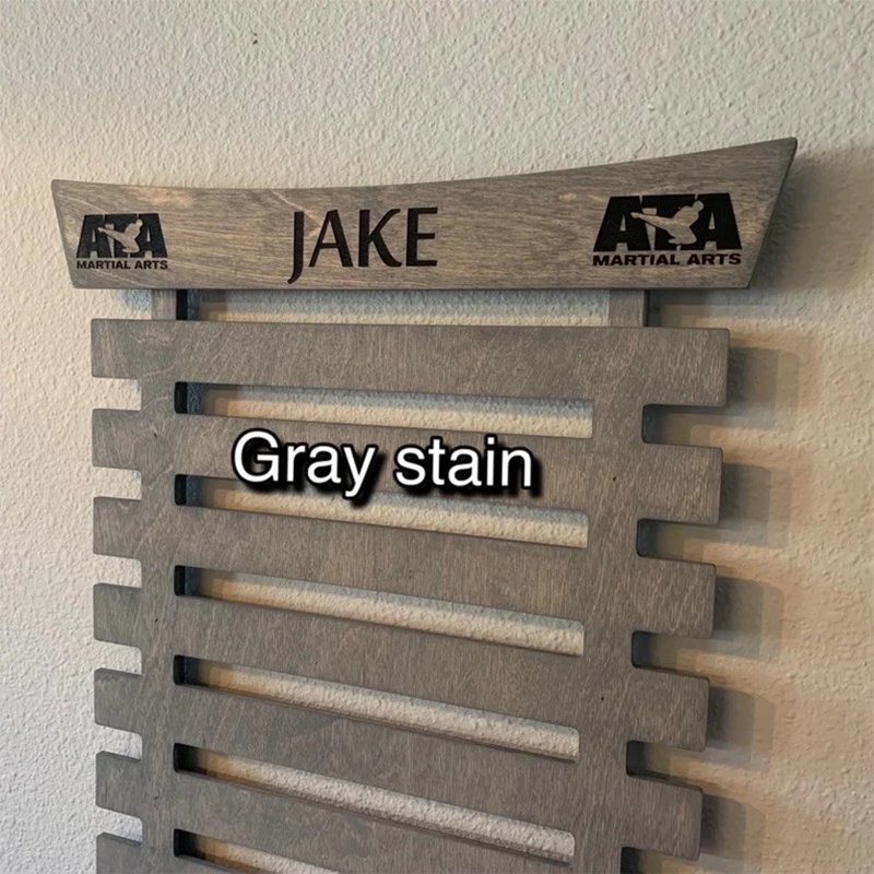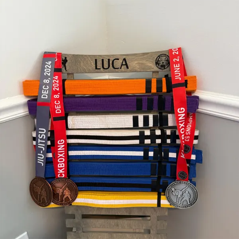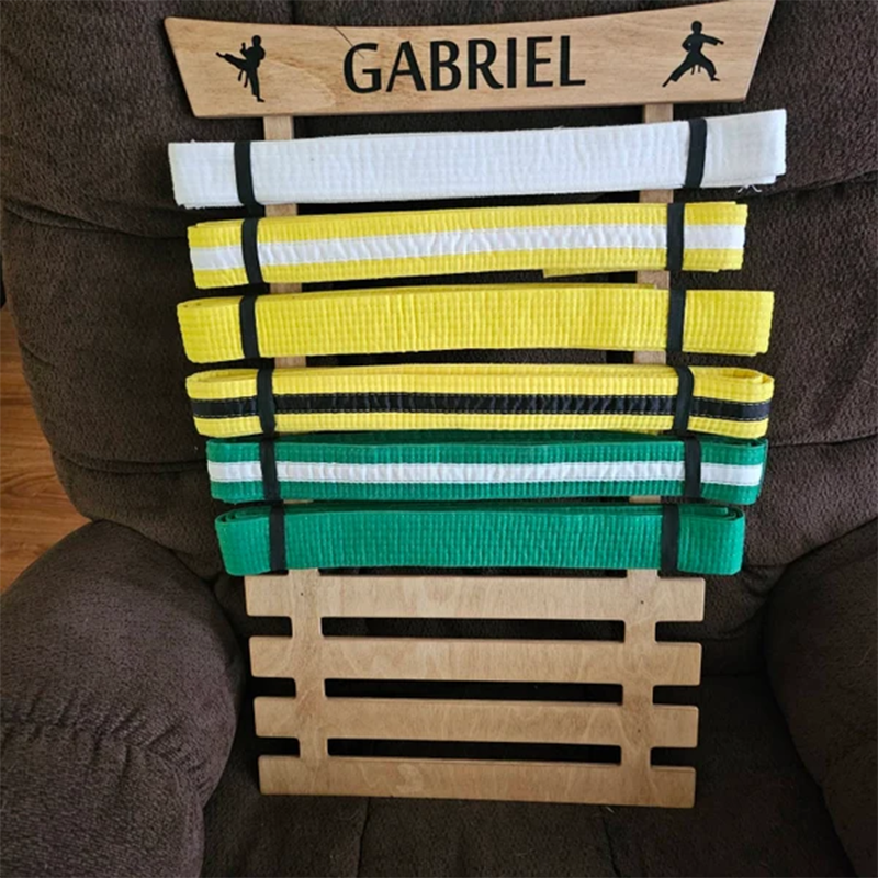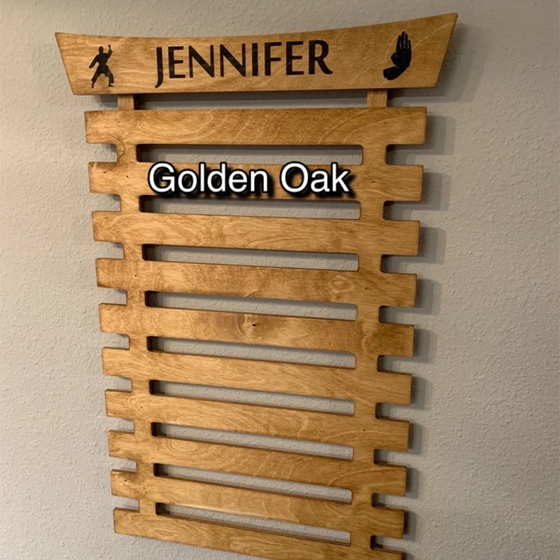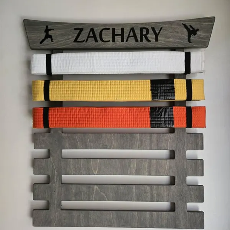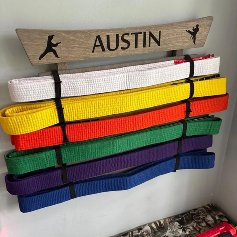 The Martial Arts Belt Display comes ready to hang out of box. It is made from quality materials and personalized to make it a one-of-a-kind piece for your wall. These make perfect gifts for black belt graduation or if your just starting out on your journey and everywhere in between. You can choose between 3 to 14 belt rank depending on your needs. *Belts are NOT included