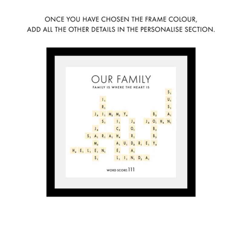 In the main menu, choose the style and colour frame. Then in the personalisation section, add your family name and any message underneath that, then list the names you would like for the scrabble pieces. I will then send you a visual for you to check and sign off, before we produce your item.