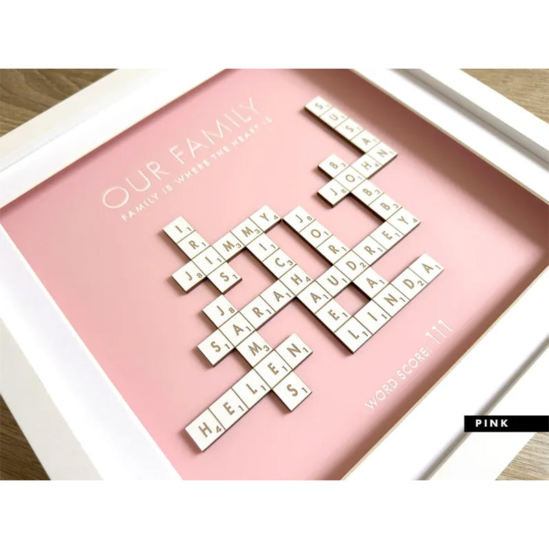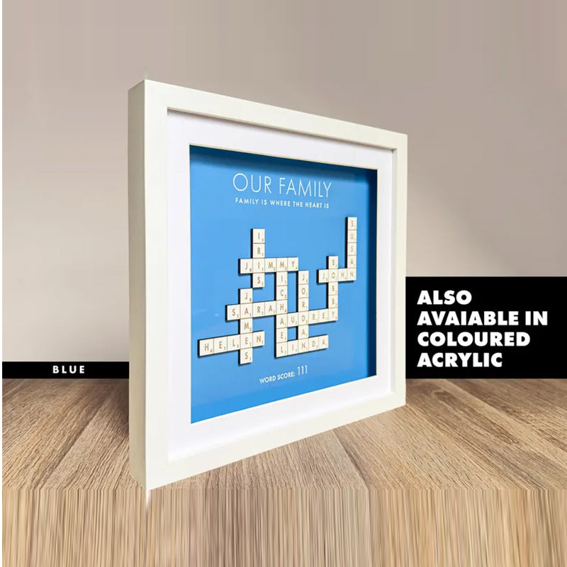 Create a meaningful family keepsake with our Personalised Scrabble Names Frame, handcrafted with natural wood and coloured acrylic to fit your family names in a charming Scrabble board design. Perfect for family gatherings, special events, or as a heartfelt gift, this elegant decor comes in a choice of 27cm x 27cm white or black frame, allowing it to blend seamlessly into any home. You can fully customise the names of your family members, giving it a truly personal touch.