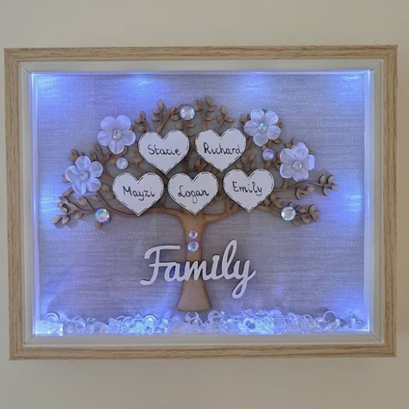 All frames are carefully customized with your choice of background, wooden family tree, hand-painted "love" and heart decorations. The tree is beautifully decorated with toppers, which are subject to availability and may vary slightly from pictured. It comes with optional loose crystals and LED lights for a lovely luxe look.
