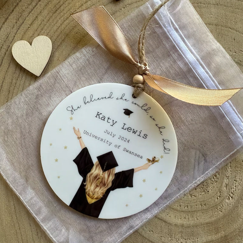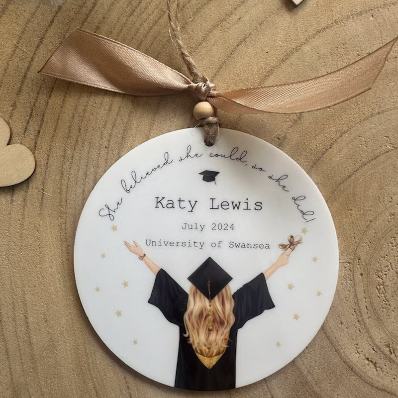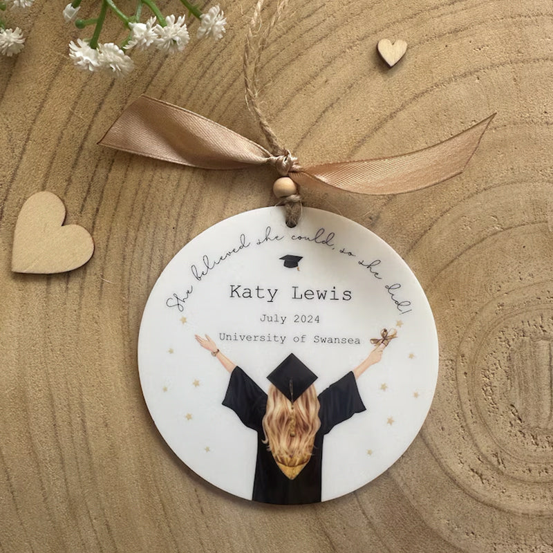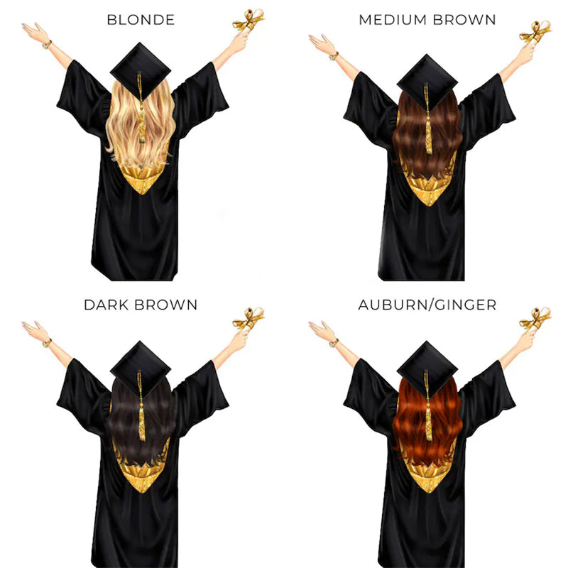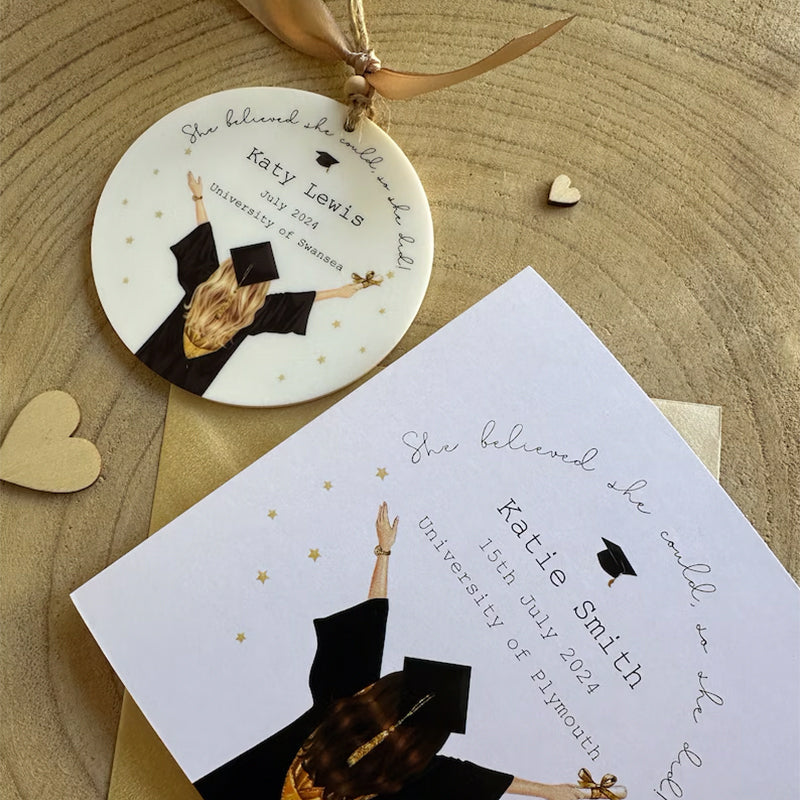 A beautiful gift for a girl graduating from University this year, featuring a girl with mortar board and scroll with the hair colour of your choice, along with the wording "She believed she could, so she did".
