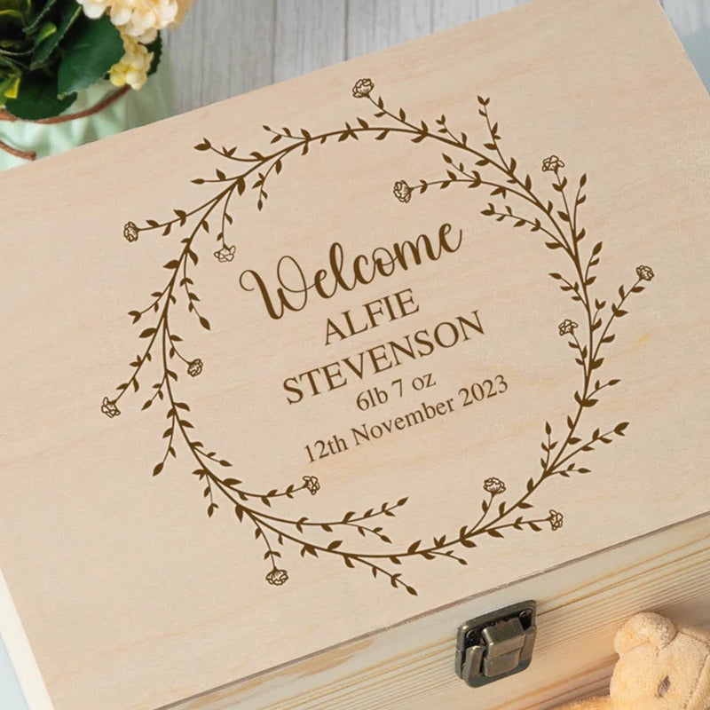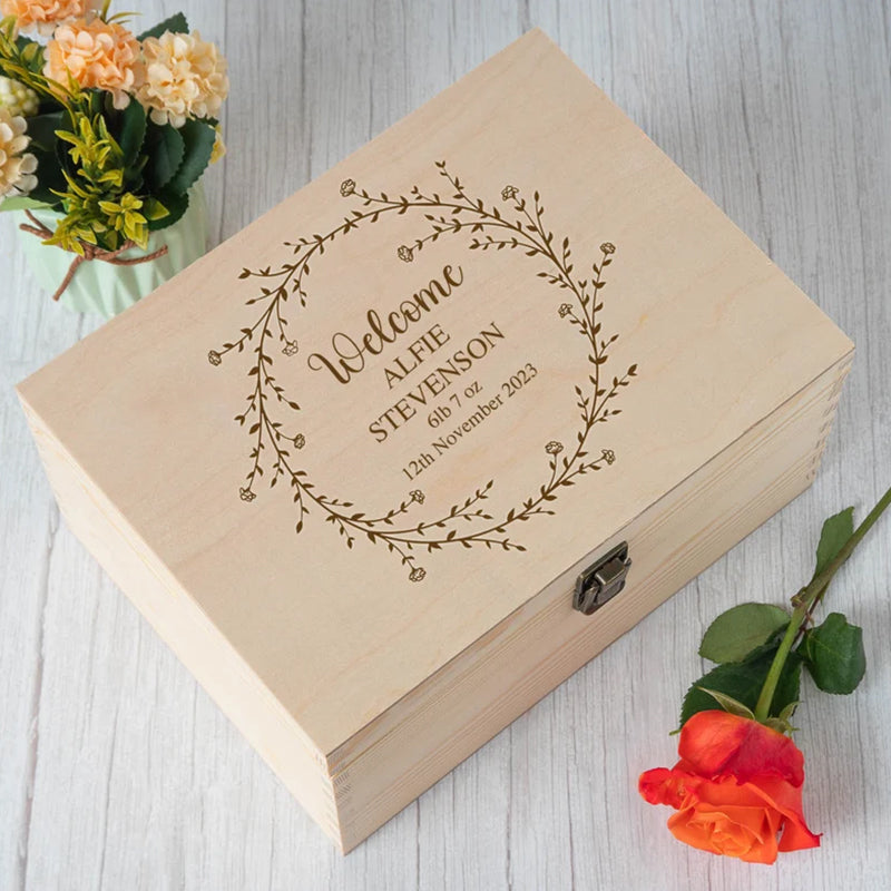 Our Personalised New Baby Large Wooden Memory Box is the perfect gift idea for your new born baby to keep all their little keepsakes and memories stored away in a beautiful wooden box.