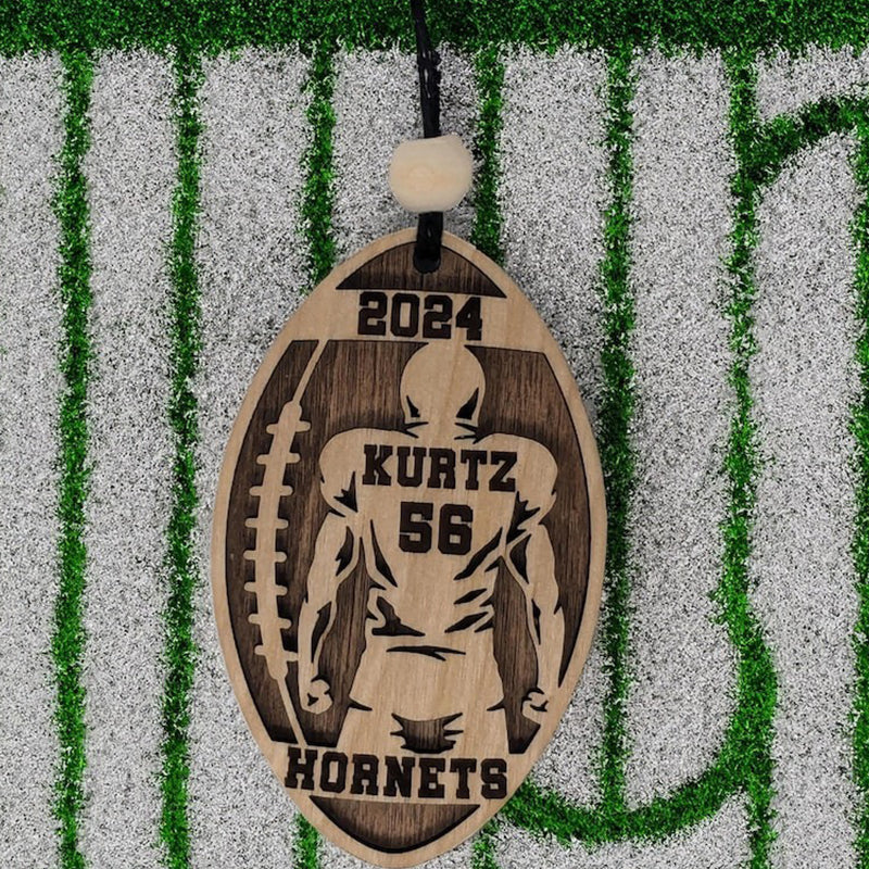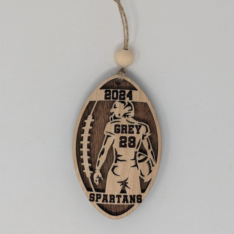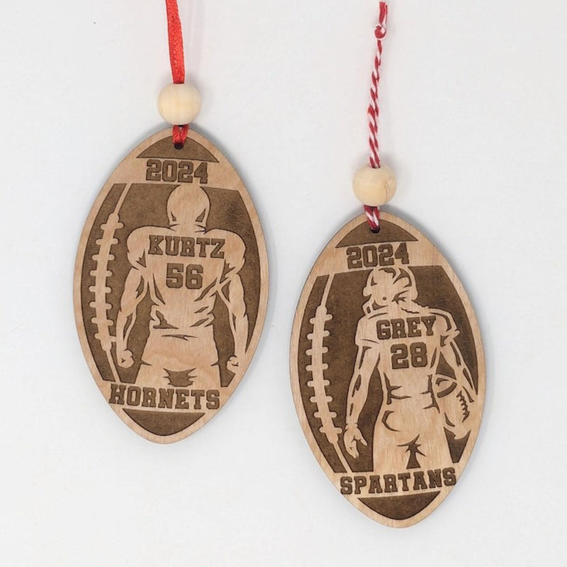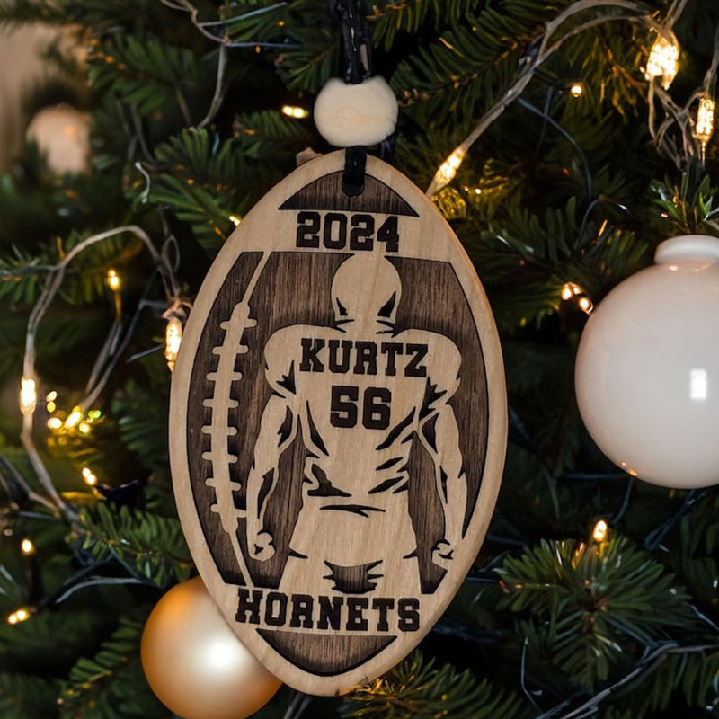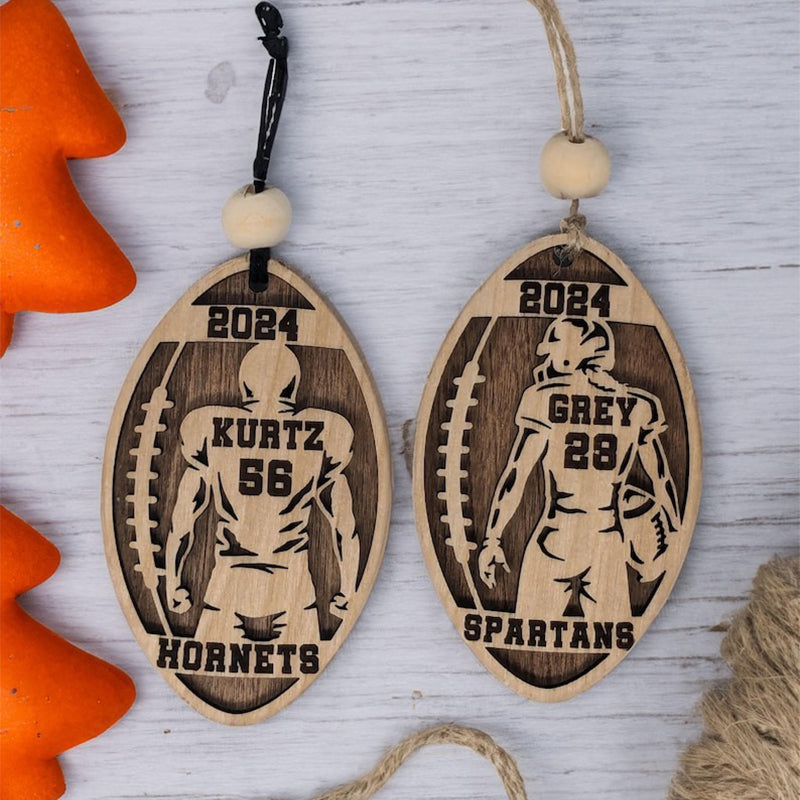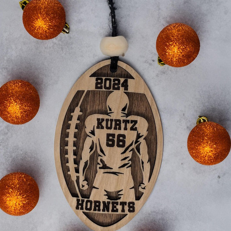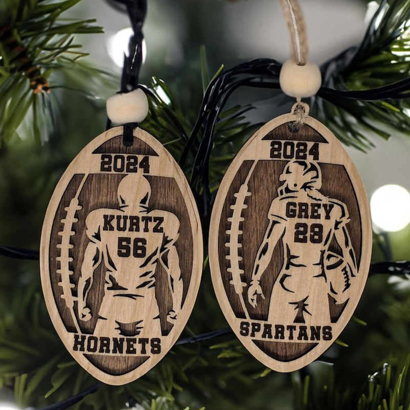 Celebrate the dedication and spirit of your favorite athlete with our Personalized Football Player Ornament! Shaped like a football, this layered ornament showcases the outline of your player with their name and number emblazoned on the back of the jersey. Complete with the year above and the school name below, it’s a perfect keepsake that captures a memorable season.