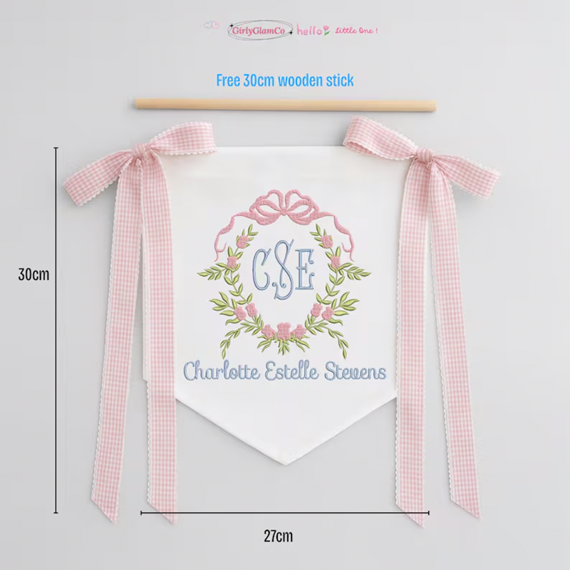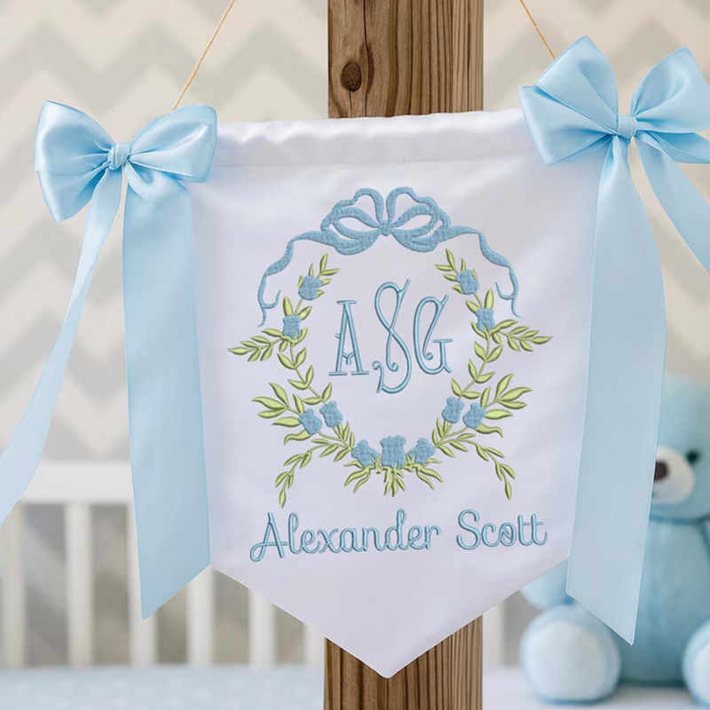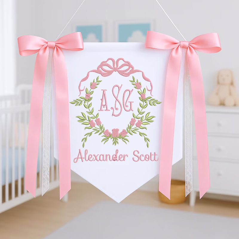 Personalized Baby Banner, Floral Crest Welcome Banner with bows, Baby Banner with bows, Hospital Door Sign, Baby Shower Gifts, Newborn Gifts