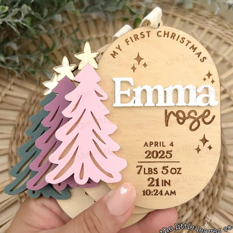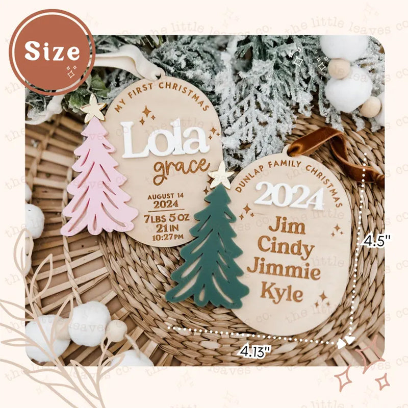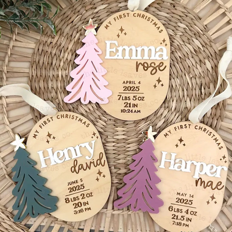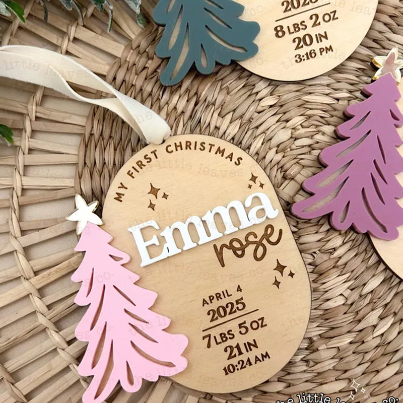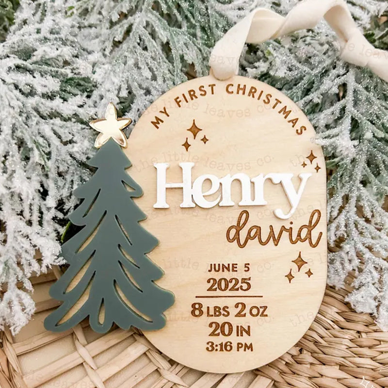 This Custom Name Ornament celebrates a little one's first Christmas! Featuring personalized baby stats on durable wood, it’s the perfect addition to any Christmas tree. With with love and care!