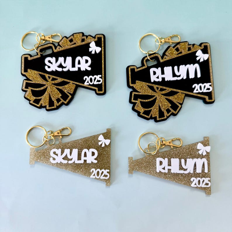 Start the school year strong with this Personalized Cheer Backpack Tag, the perfect cheerleader back to school gift, spirit squad name tag, or cheer senior bag accessory. Each acrylic tag features a custom name design and comes with a bonus adhesive mini megaphone sticker, making it both fun and functional for lockers, backpacks, or team bags.